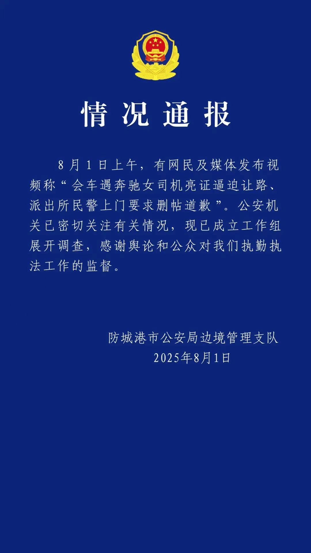 8月1日晚,防城港市公安局邊境管理支隊(duì)發(fā)布情況通報(bào):8月1日上午,有網(wǎng)民及媒體發(fā)布視頻稱“會(huì)車遇奔馳女司機(jī)亮證逼迫讓路、派出所民警上門要求刪帖道歉”。公安機(jī)關(guān)已密切關(guān)注有關(guān)情況,現(xiàn)已成立工作組展開調(diào)查,感謝輿論和公眾對(duì)我們執(zhí)勤執(zhí)法工作的監(jiān)督。