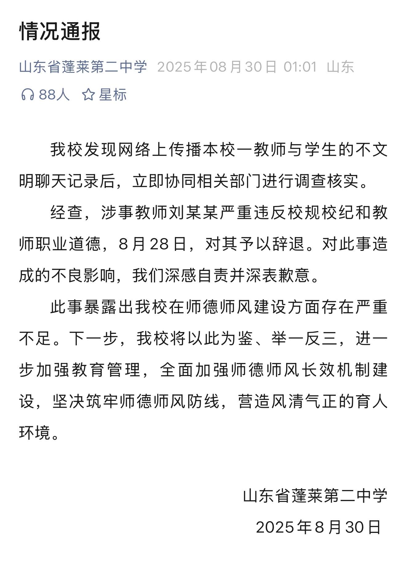 8月30日1點(diǎn)1分,山東省煙臺(tái)市蓬萊第二中學(xué)通過(guò)官方微信公眾號(hào)發(fā)布情況通報(bào),對(duì)網(wǎng)傳“教師與學(xué)生不文明聊天記錄”事件進(jìn)行回應(yīng),通報(bào)原文如下: