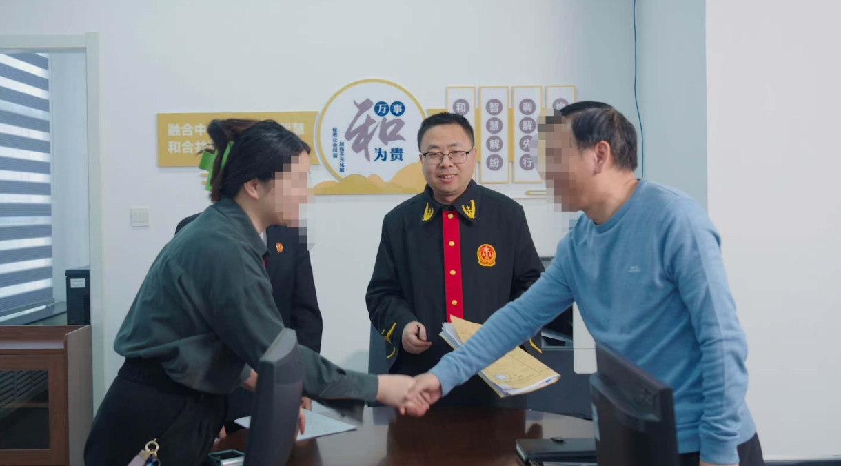 圖為中國(新疆)自由貿(mào)易試驗區(qū)烏魯木齊片區(qū)法庭化解一起買賣合同糾紛,當(dāng)事人雙方握手言和。通訊員 王雅楠 攝