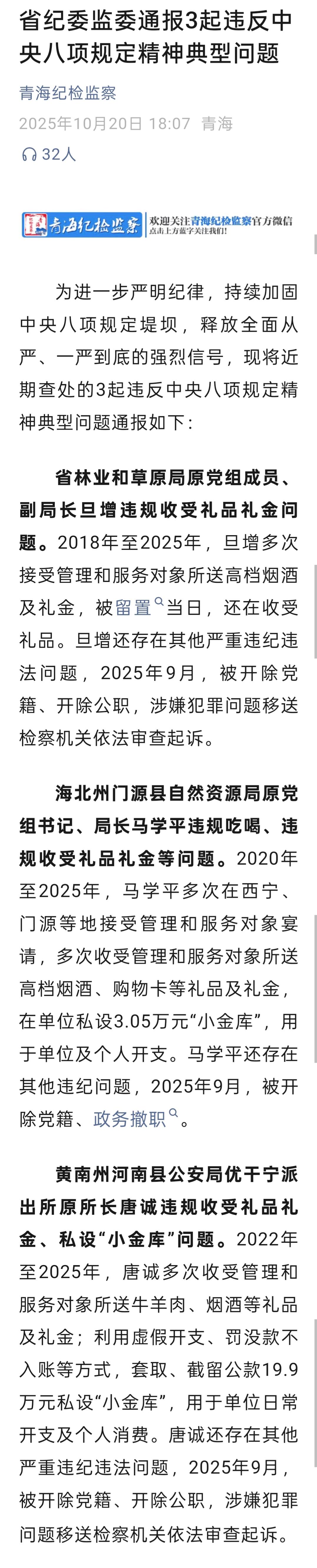 省林業(yè)和草原局原黨組成員、副局長旦增違規(guī)收受禮品禮金問題。2018年至2025年,旦增多次接受管理和服務(wù)對(duì)象所送高檔煙酒及禮金,被留置當(dāng)日,還在收受禮品。旦增還存在其他嚴(yán)重違紀(jì)違法問題,2025年9月,被開除黨籍、開除公職,涉嫌犯罪問題移送檢察機(jī)關(guān)依法審查起訴。