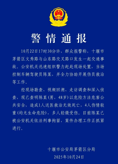 10月25日凌晨,湖北省十堰市公安局茅箭區(qū)分局發(fā)布警情通報(bào):10月22日17時(shí)30分許,群眾報(bào)警稱,十堰市茅箭區(qū)文秀路與山東路交叉路口發(fā)生一起交通事故。公安機(jī)關(guān)迅速組織警力趕赴現(xiàn)場(chǎng)處置,當(dāng)場(chǎng)控制車輛駕駛員陳某,并全力協(xié)助開展傷員救治等工作。