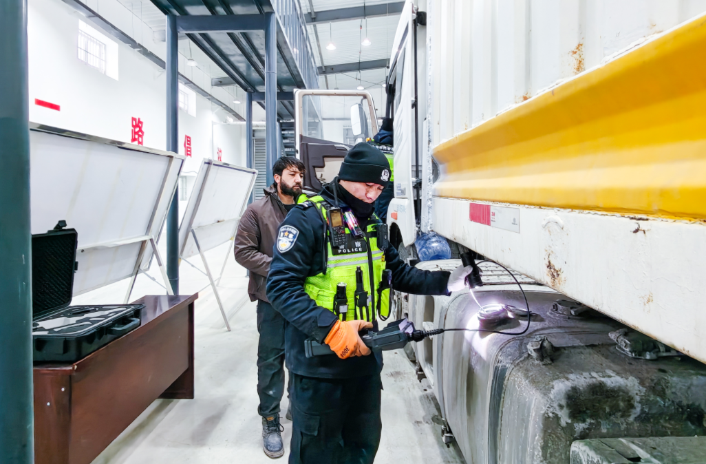 圖為執(zhí)勤民警在國門前查驗出境貨車并進行人證比對。