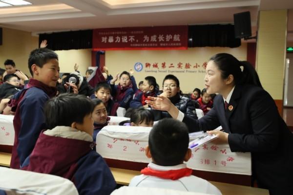 圖為聊城市人民檢察院檢察官走進(jìn)第二實(shí)驗(yàn)小學(xué),進(jìn)行“對(duì)暴力說(shuō)不,為成長(zhǎng)護(hù)航”有獎(jiǎng)問(wèn)答。