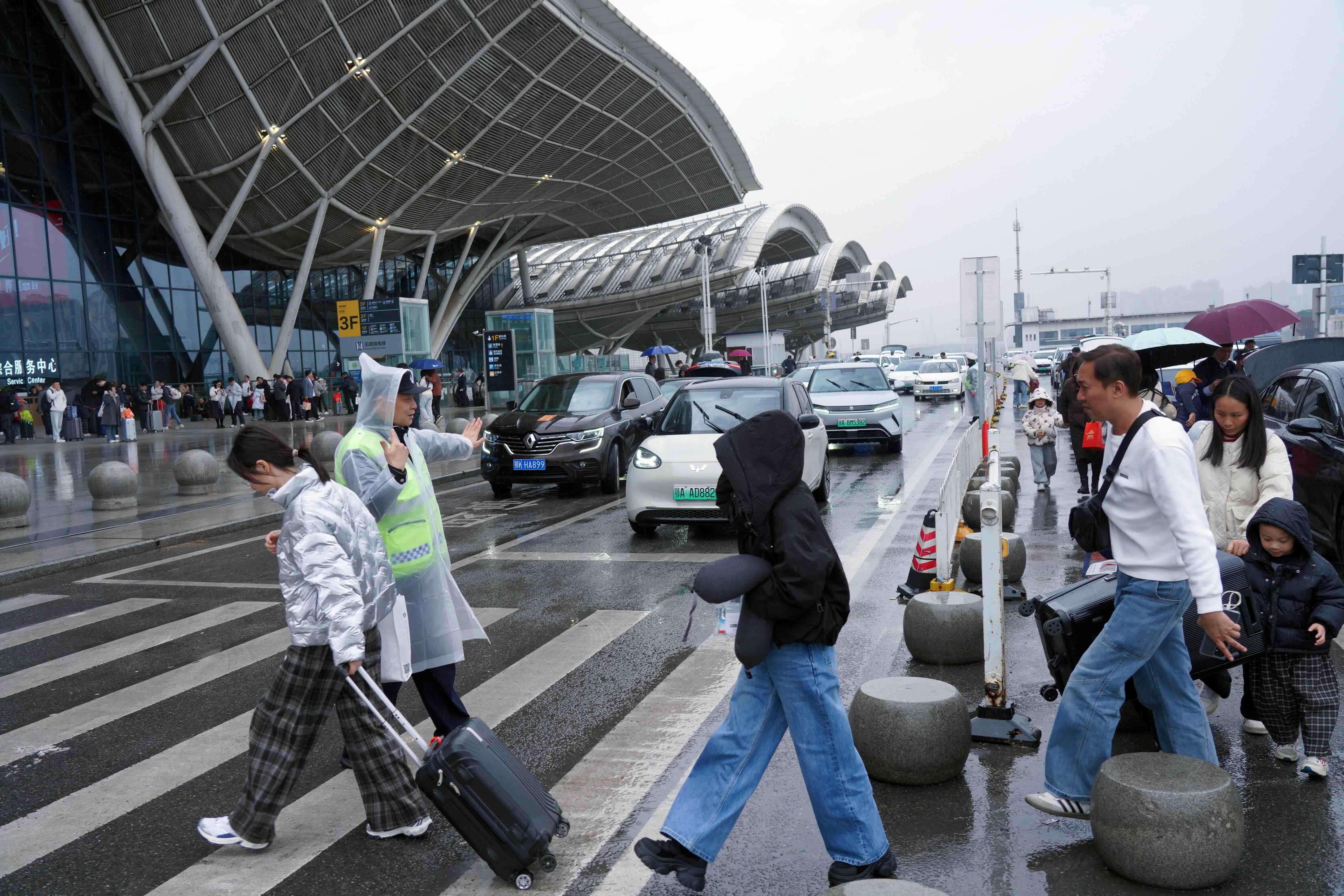 圖為武漢鐵路公安處武漢站派出所民警在雨中指揮交通。
