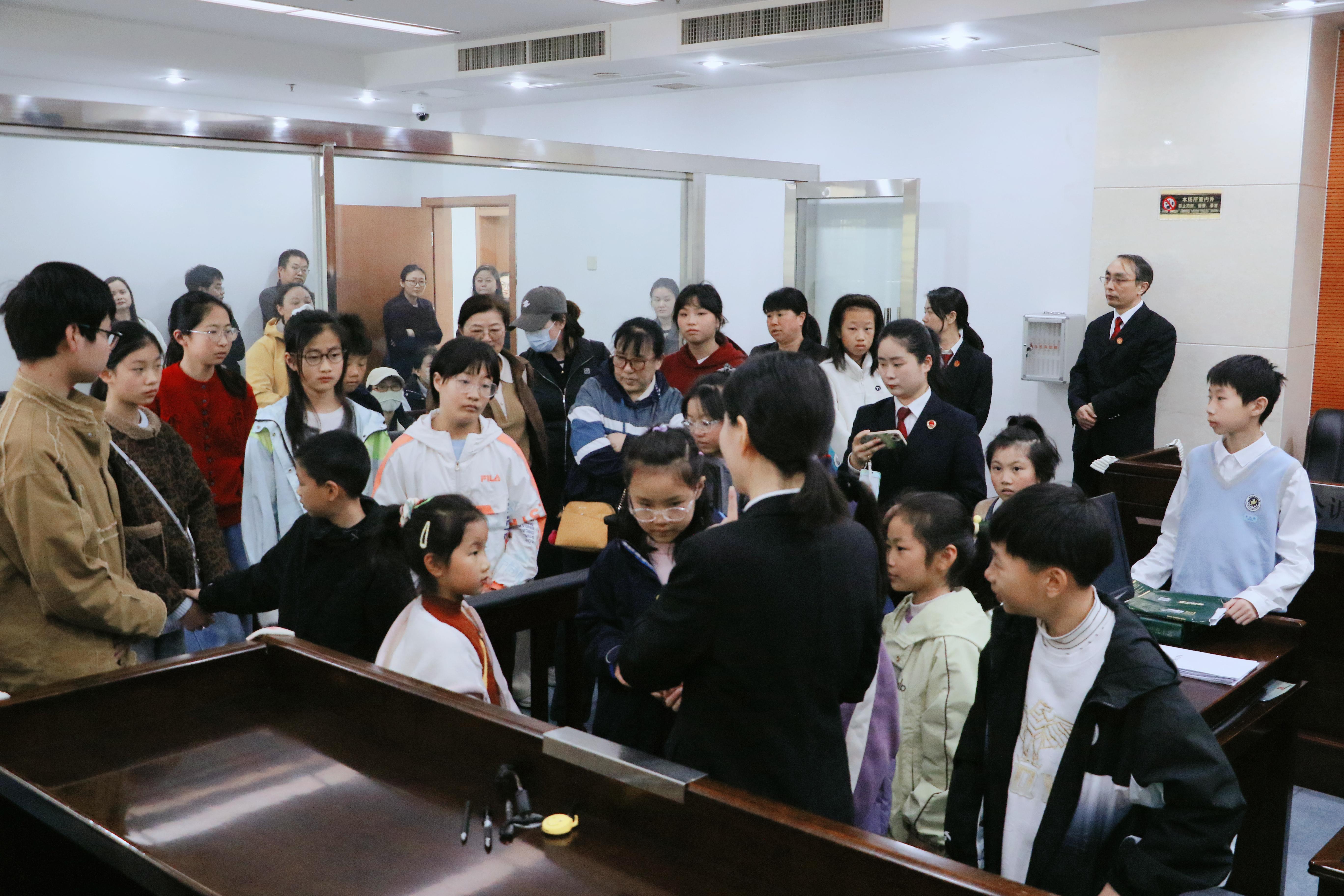 “法徽上的天平代表公平正義!”在棲霞區(qū)人民法院,同學(xué)們在法官的帶領(lǐng)下參觀了訴訟服務(wù)中心、審判法庭等辦公場所,直觀了解了司法案件辦理全過程,“零距離”接受法治教育。