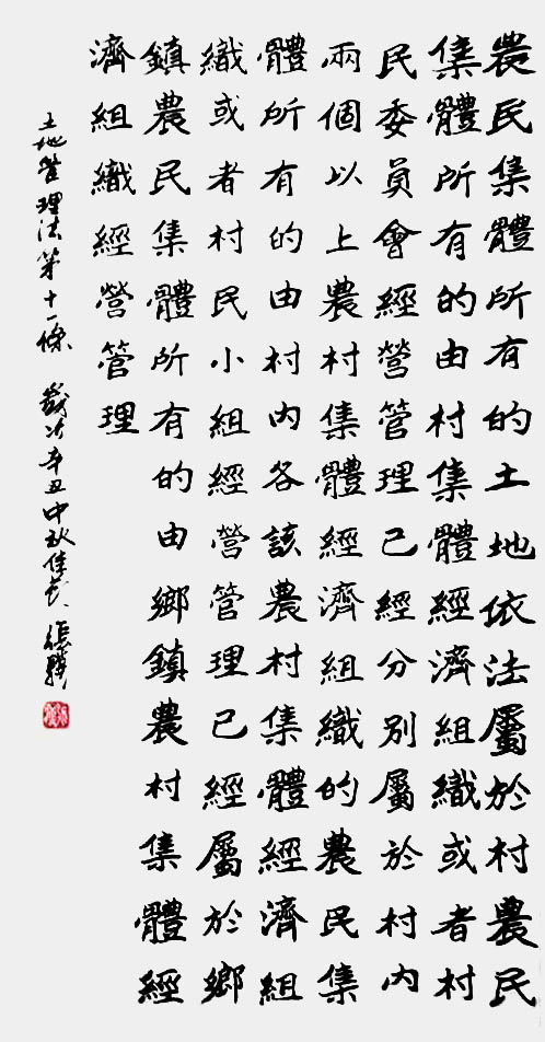 繼1600余位書法家參與書寫《中華人民共和國民法典》全部1260條法條之后,法治日報社聯(lián)合自然資源部法規(guī)司、自然資源部書畫研究會和北京昌平書法家協(xié)會,將筆端對準土地管理“一法一條例”,即《中華人民共和國土地管理法》和《中華人民共和國土地管理法實施條例》。