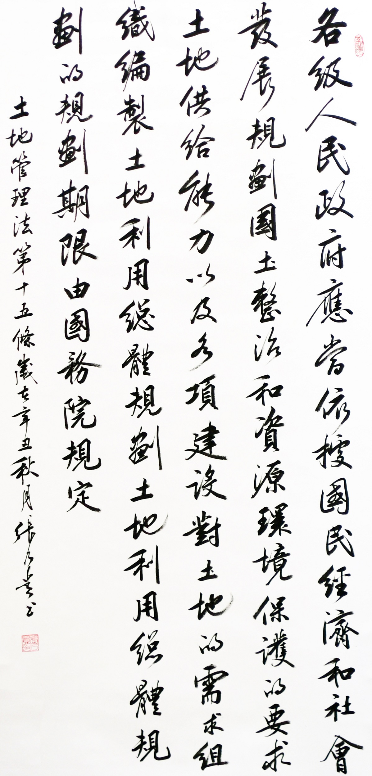 繼1600余位書法家參與書寫《中華人民共和國民法典》全部1260條法條之后,法治日報社聯(lián)合自然資源部法規(guī)司、自然資源部書畫研究會和北京昌平書法家協(xié)會,將筆端對準土地管理“一法一條例”,即《中華人民共和國土地管理法》和《中華人民共和國土地管理法實施條例》。