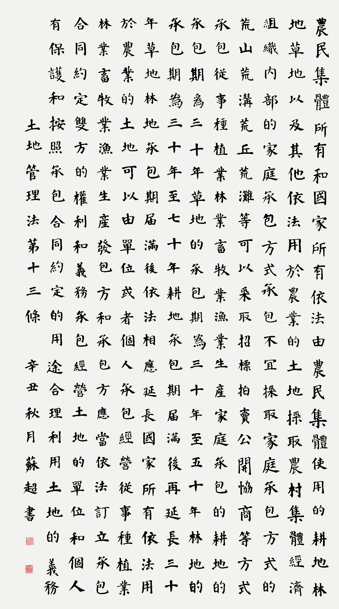 繼1600余位書法家參與書寫《中華人民共和國民法典》全部1260條法條之后,法治日?qǐng)?bào)社聯(lián)合自然資源部法規(guī)司、自然資源部書畫研究會(huì)和北京昌平書法家協(xié)會(huì),將筆端對(duì)準(zhǔn)土地管理“一法一條例”,即《中華人民共和國土地管理法》和《中華人民共和國土地管理法實(shí)施條例》。