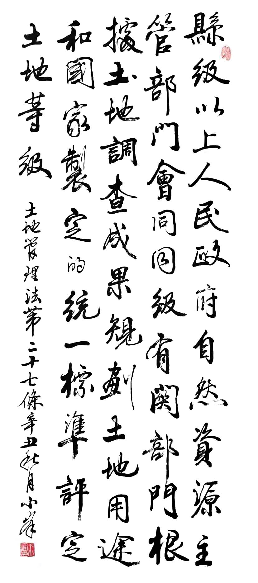 繼1600余位書法家參與書寫《中華人民共和國民法典》全部1260條法條之后,法治日報社聯(lián)合自然資源部法規(guī)司、自然資源部書畫研究會和北京昌平書法家協(xié)會,將筆端對準(zhǔn)土地管理“一法一條例”,即《中華人民共和國土地管理法》和《中華人民共和國土地管理法實施條例》。