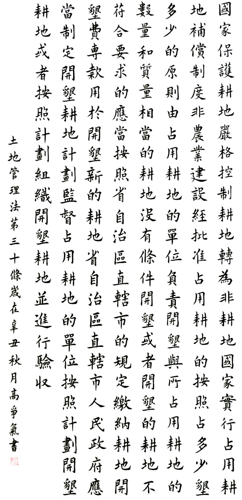 繼1600余位書法家參與書寫《中華人民共和國民法典》全部1260條法條之后,法治日報(bào)社聯(lián)合自然資源部法規(guī)司、自然資源部書畫研究會和北京昌平書法家協(xié)會,將筆端對準(zhǔn)土地管理“一法一條例”,即《中華人民共和國土地管理法》和《中華人民共和國土地管理法實(shí)施條例》。