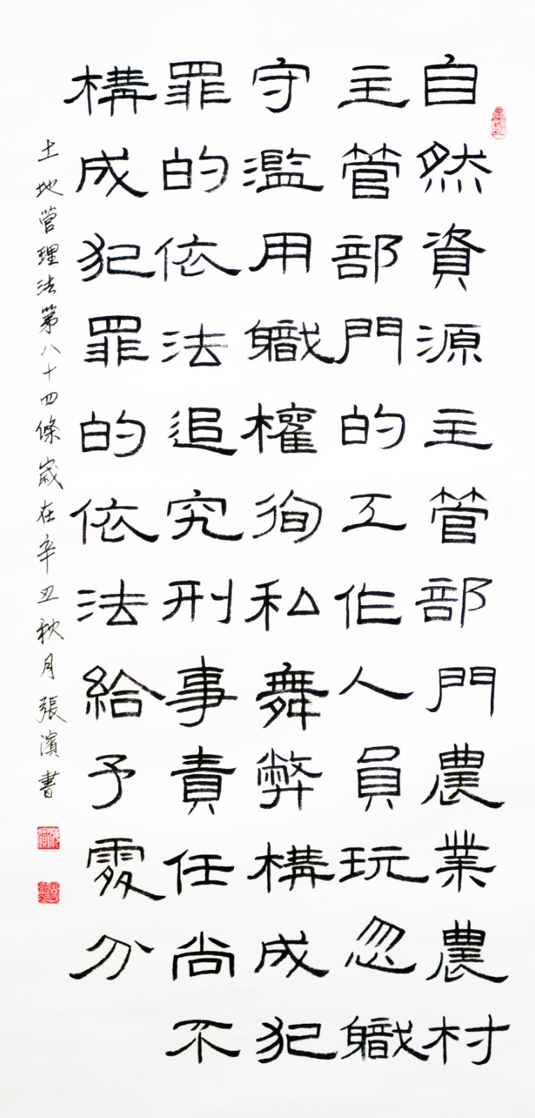 繼1600余位書法家參與書寫《中華人民共和國民法典》全部1260條法條之后,法治日報(bào)社聯(lián)合自然資源部法規(guī)司、自然資源部書畫研究會和北京昌平書法家協(xié)會,將筆端對準(zhǔn)土地管理“一法一條例”,即《中華人民共和國土地管理法》和《中華人民共和國土地管理法實(shí)施條例》。