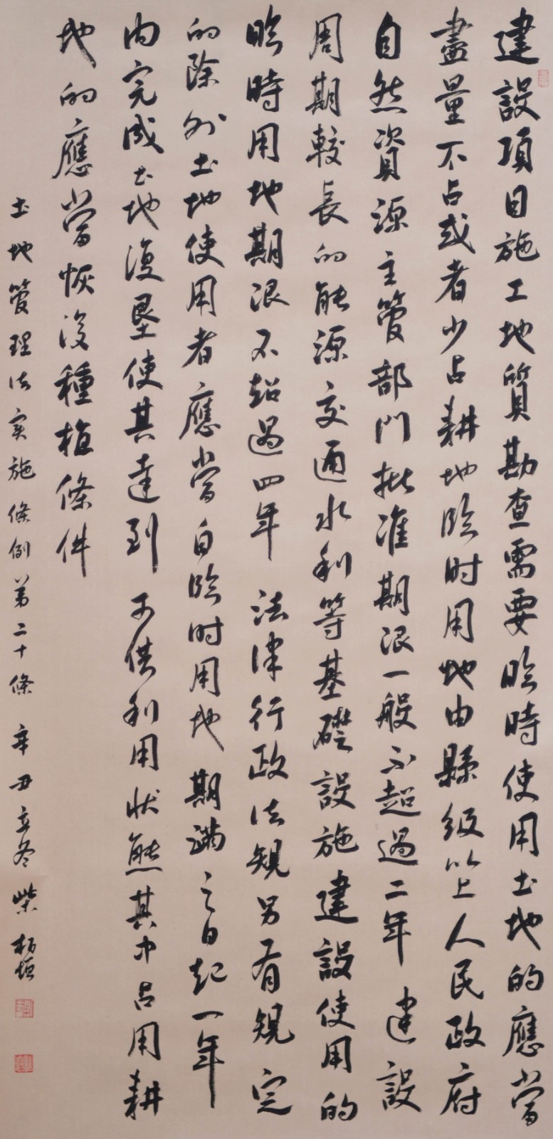 繼1600余位書法家參與書寫《中華人民共和國民法典》全部1260條法條之后,法治日報社聯(lián)合自然資源部法規(guī)司、自然資源部書畫研究會和北京昌平書法家協(xié)會,將筆端對準土地管理“一法一條例”,即《中華人民共和國土地管理法》和《中華人民共和國土地管理法實施條例》。