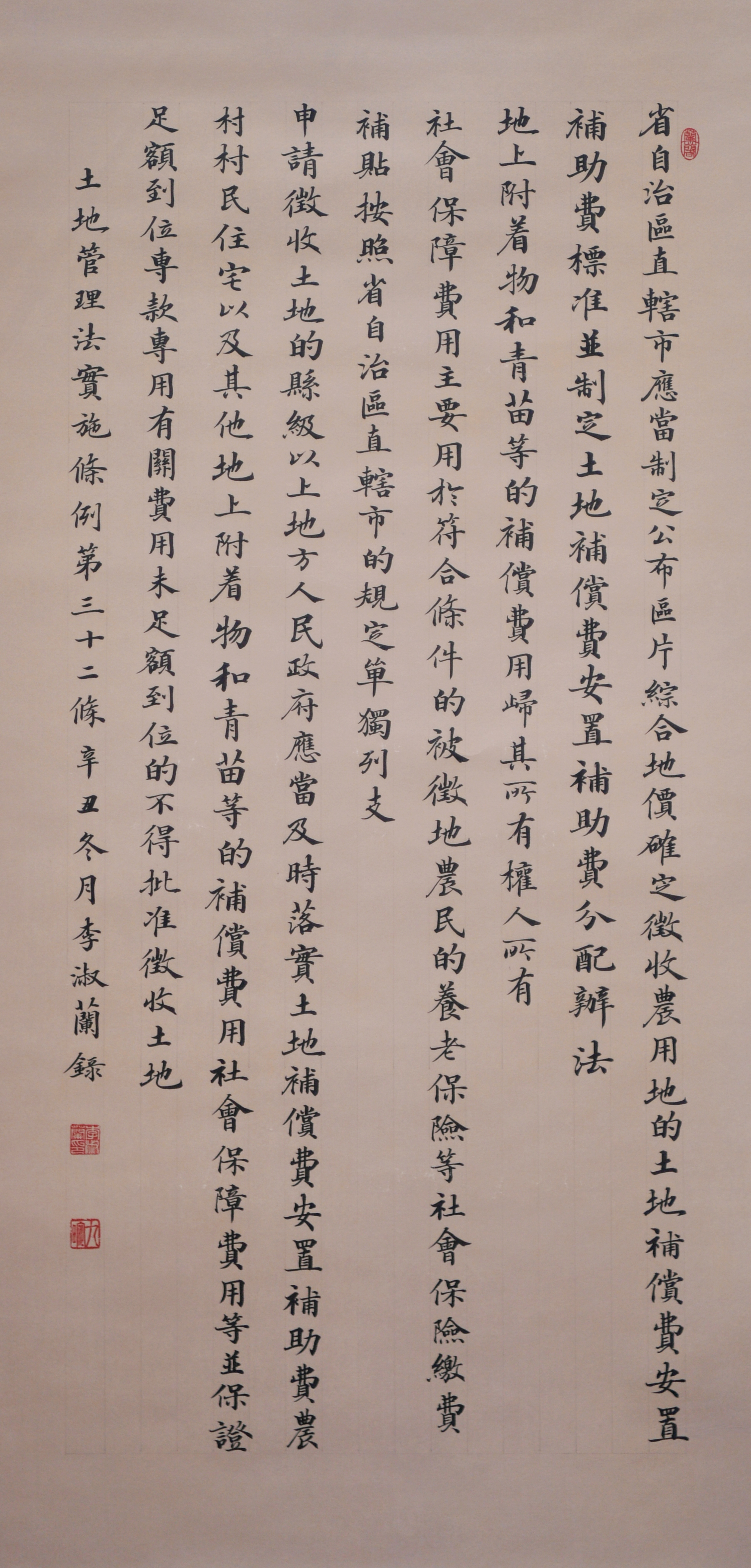 繼1600余位書法家參與書寫《中華人民共和國民法典》全部1260條法條之后,法治日報(bào)社聯(lián)合自然資源部法規(guī)司、自然資源部書畫研究會(huì)和北京昌平書法家協(xié)會(huì),將筆端對準(zhǔn)土地管理“一法一條例”,即《中華人民共和國土地管理法》和《中華人民共和國土地管理法實(shí)施條例》。