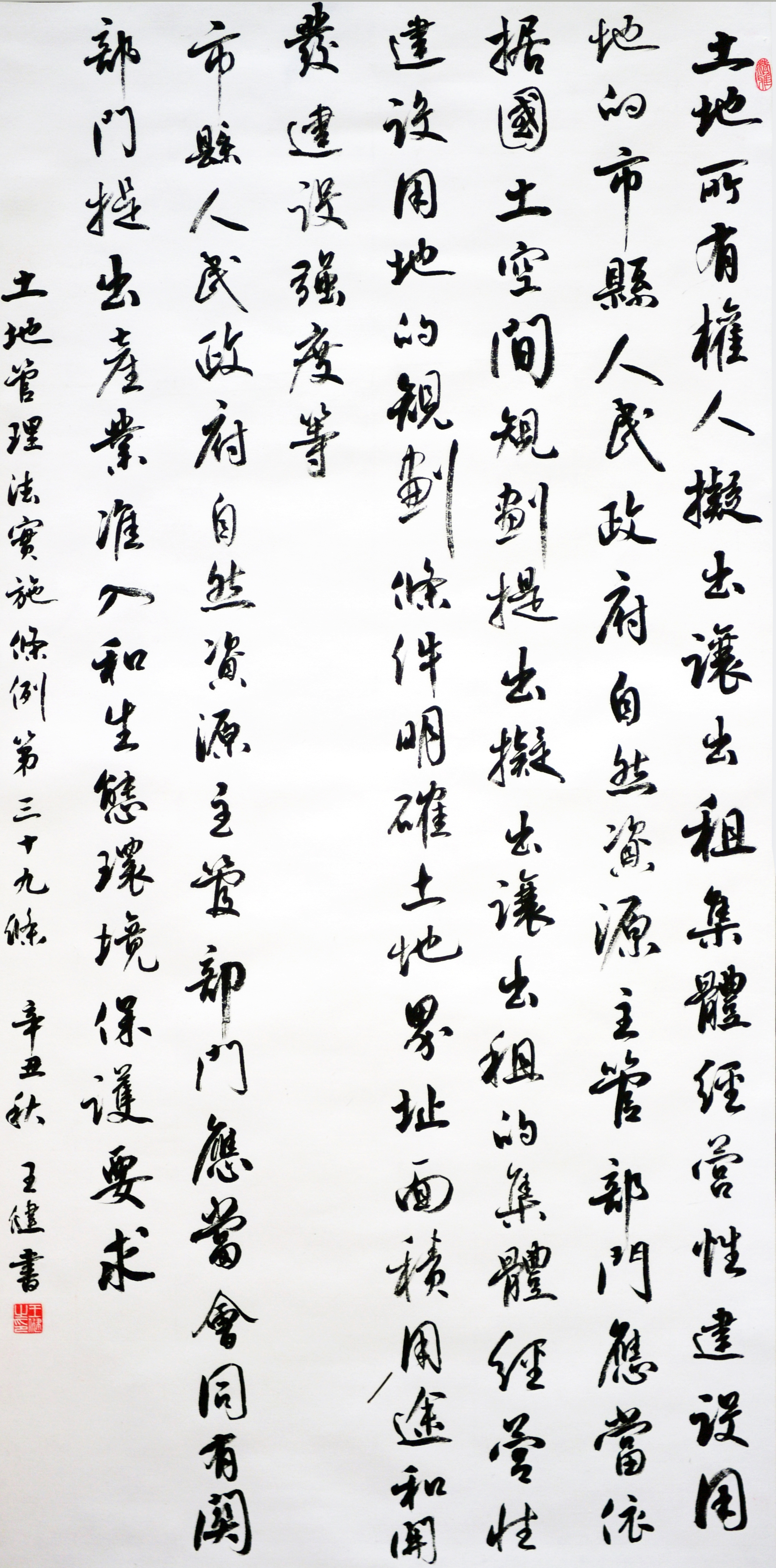 繼1600余位書(shū)法家參與書(shū)寫(xiě)《中華人民共和國(guó)民法典》全部1260條法條之后,法治日?qǐng)?bào)社聯(lián)合自然資源部法規(guī)司、自然資源部書(shū)畫(huà)研究會(huì)和北京昌平書(shū)法家協(xié)會(huì),將筆端對(duì)準(zhǔn)土地管理“一法一條例”,即《中華人民共和國(guó)土地管理法》和《中華人民共和國(guó)土地管理法實(shí)施條例》。