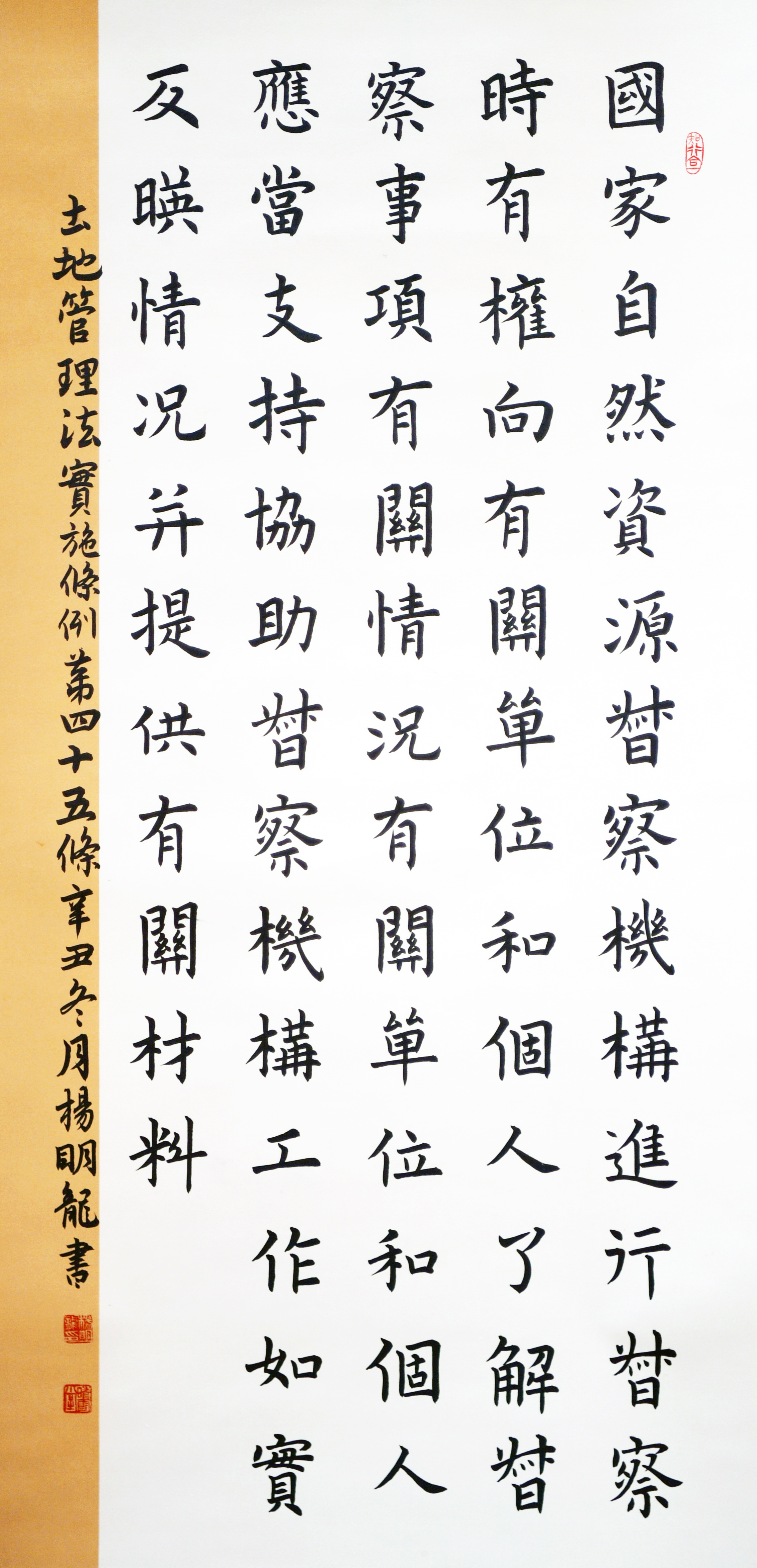 繼1600余位書法家參與書寫《中華人民共和國民法典》全部1260條法條之后,法治日?qǐng)?bào)社聯(lián)合自然資源部法規(guī)司、自然資源部書畫研究會(huì)和北京昌平書法家協(xié)會(huì),將筆端對(duì)準(zhǔn)土地管理“一法一條例”,即《中華人民共和國土地管理法》和《中華人民共和國土地管理法實(shí)施條例》。