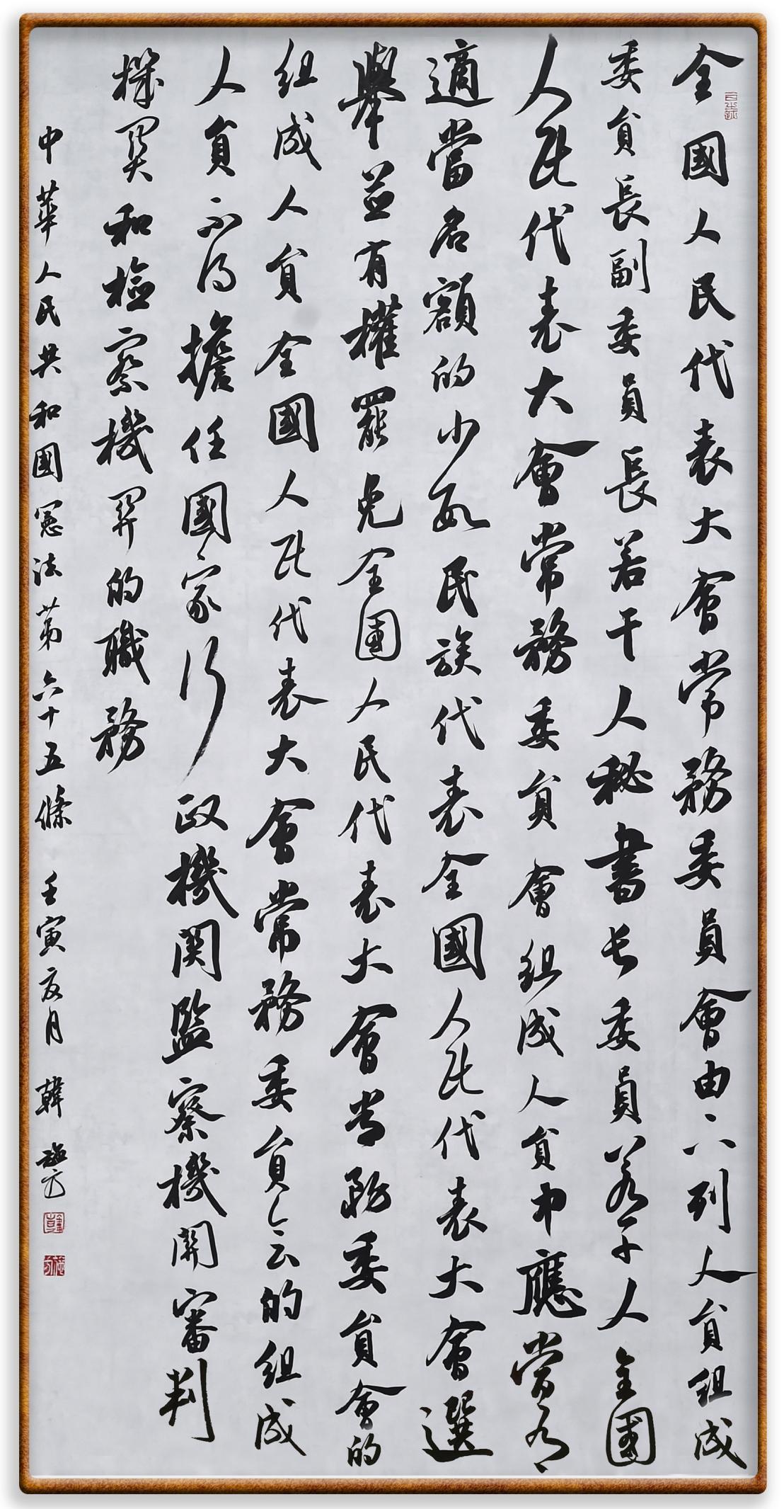 繼《中華人民共和國民法典》《中華人民共和國土地管理法》《中華人民共和國土地管理法實(shí)施條例》《中華人民共和國法律援助法》之后,法治日?qǐng)?bào)社聯(lián)合北京市司法局、北京書法家協(xié)會(huì),將筆端對(duì)準(zhǔn)《中華人民共和國憲法》和《中華人民共和國行政處罰法》。