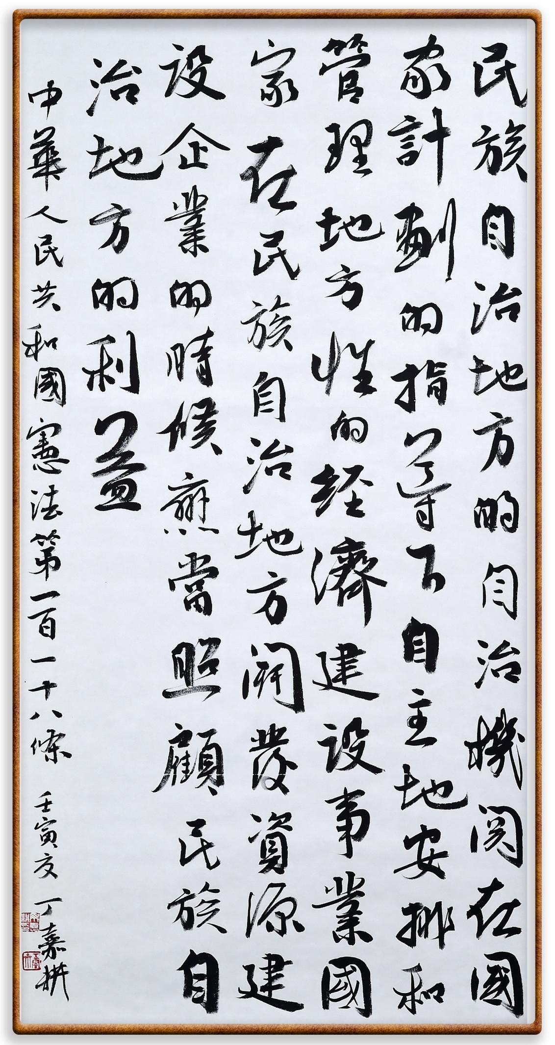 繼《中華人民共和國民法典》《中華人民共和國土地管理法》《中華人民共和國土地管理法實施條例》《中華人民共和國法律援助法》之后,法治日報社聯(lián)合北京市司法局、北京書法家協(xié)會,將筆端對準(zhǔn)《中華人民共和國憲法》和《中華人民共和國行政處罰法》。