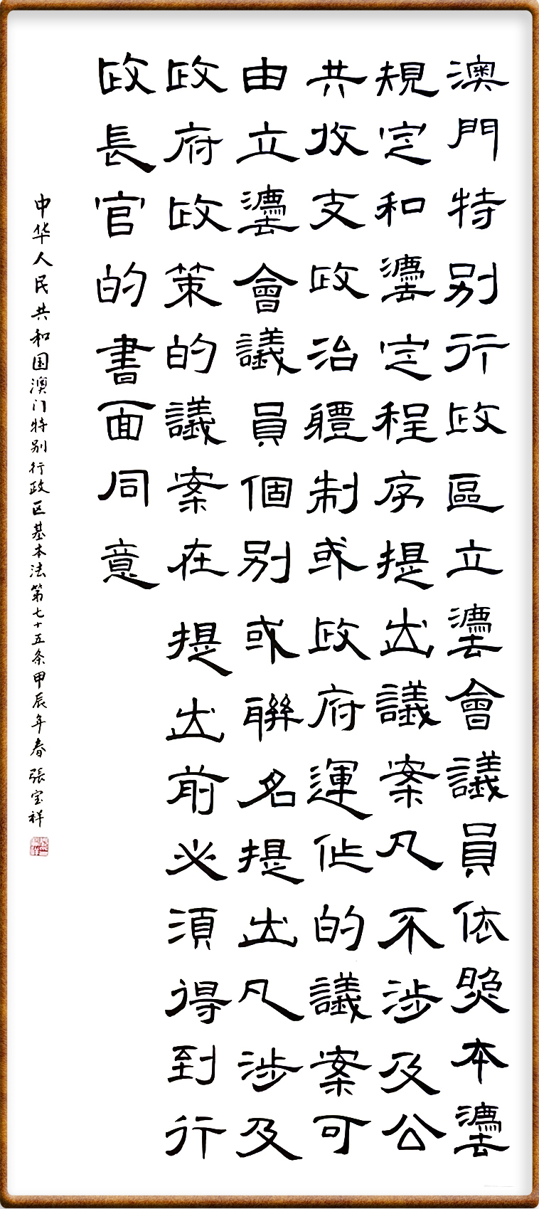 澳門基本法第七十五條 澳門特別行政區(qū)立法會議員依照本法規(guī)定和法定程序提出議案。凡不涉及公共收支、政治體制或政府運作的議案,可由立法會議員個別或聯(lián)名提出。凡涉及政府政策的議案,在提出前必須得到行政長官的書面同意。