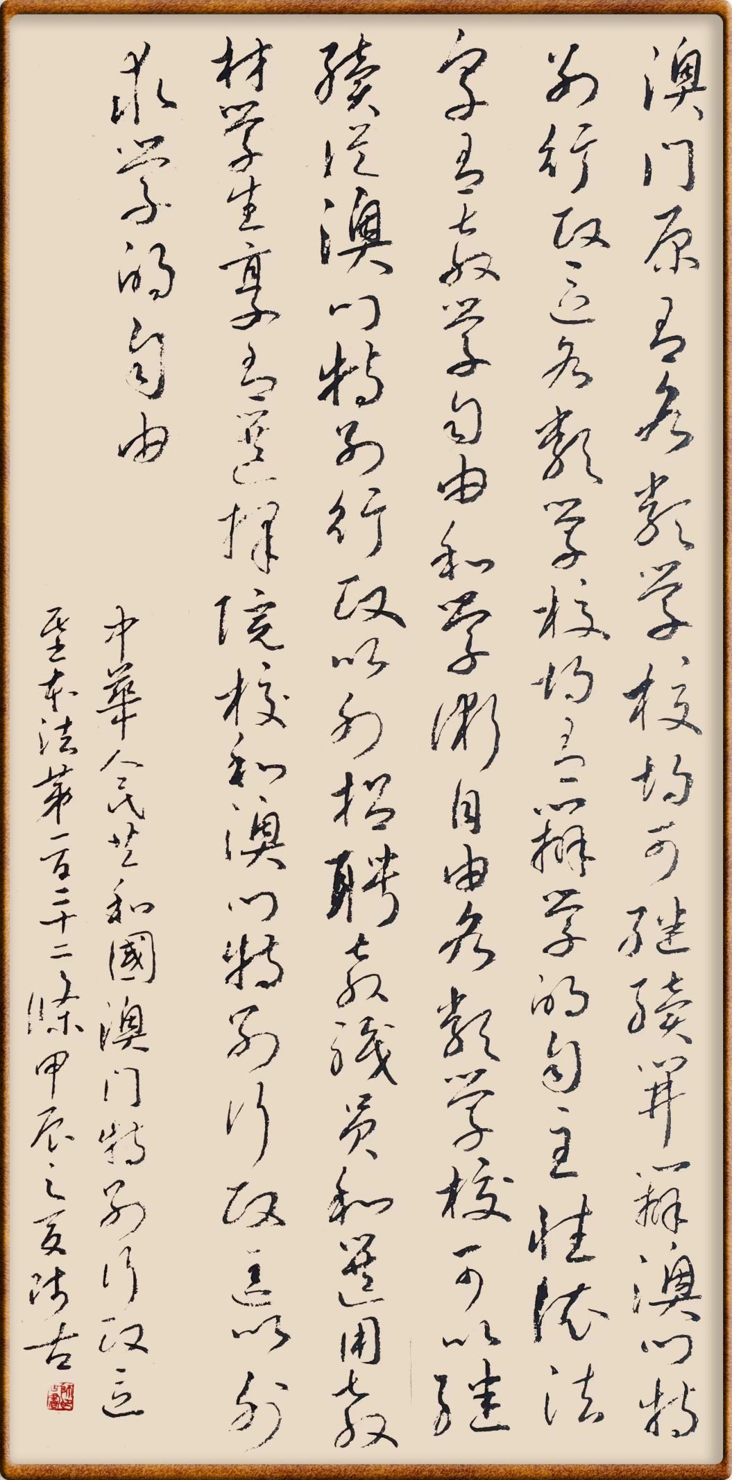 澳門(mén)基本法第一百二十二條 澳門(mén)原有各類(lèi)學(xué)校均可繼續(xù)開(kāi)辦。澳門(mén)特別行政區(qū)各類(lèi)學(xué)校均有辦學(xué)的自主性,依法享有教學(xué)自由和學(xué)術(shù)自由。