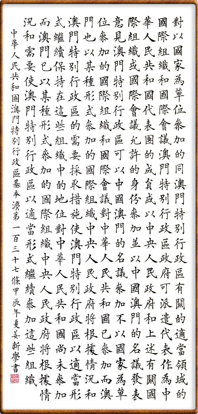 對(duì)中華人民共和國(guó)已參加而澳門也以某種形式參加的國(guó)際組織,中央人民政府將根據(jù)情況和澳門特別行政區(qū)的需要采取措施,使澳門特別行政區(qū)以適當(dāng)形式繼續(xù)保持在這些組織中的地位。