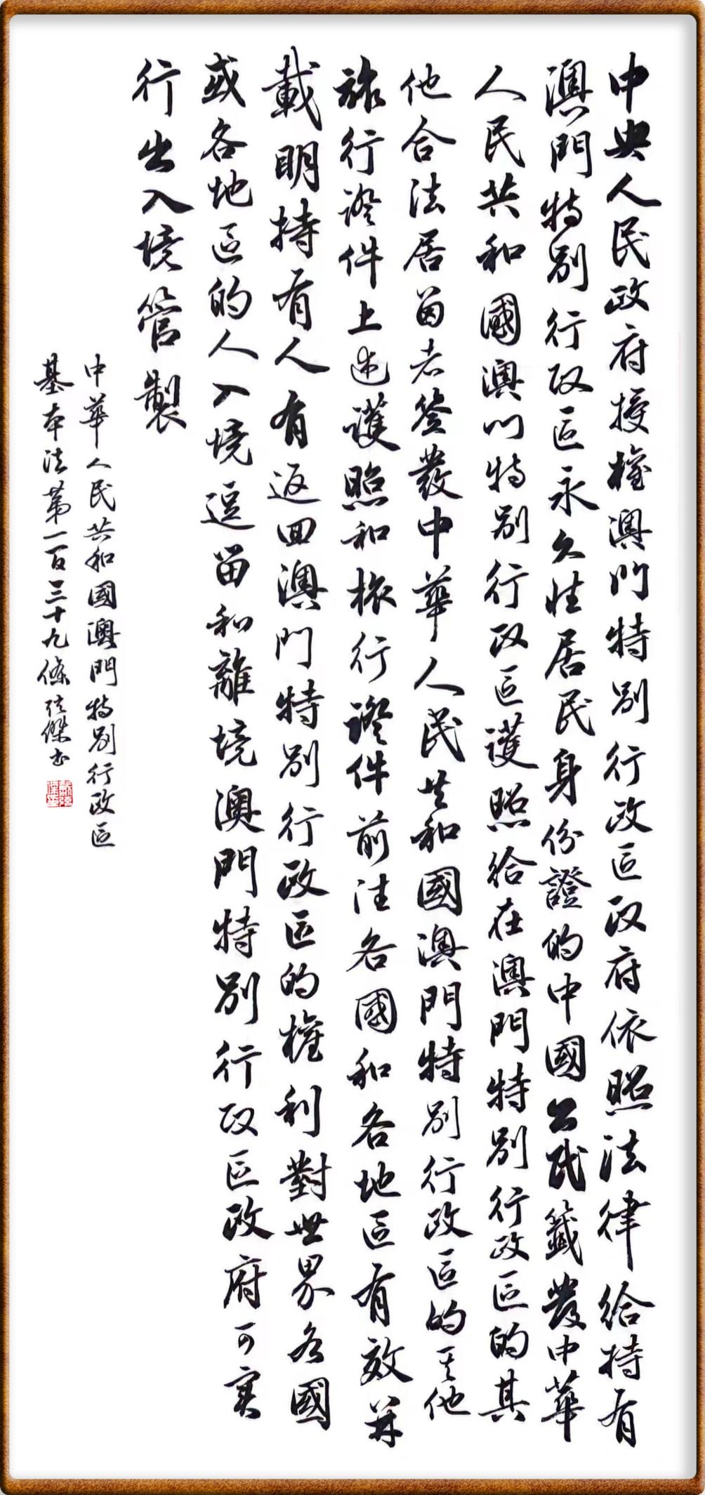 澳門基本法第一百三十九條 中央人民政府授權澳門特別行政區(qū)政府依照法律給持有澳門特別行政區(qū)永久性居民身份證的中國公民簽發(fā)中華人民共和國澳門特別行政區(qū)護照,給在澳門特別行政區(qū)的其他合法居留者簽發(fā)中華人民共和國澳門特別行政區(qū)的其他旅行證件。上述護照和旅行證件,前往各國和各地區(qū)有效,并載明持有人有返回澳門特別行政區(qū)的權利。
