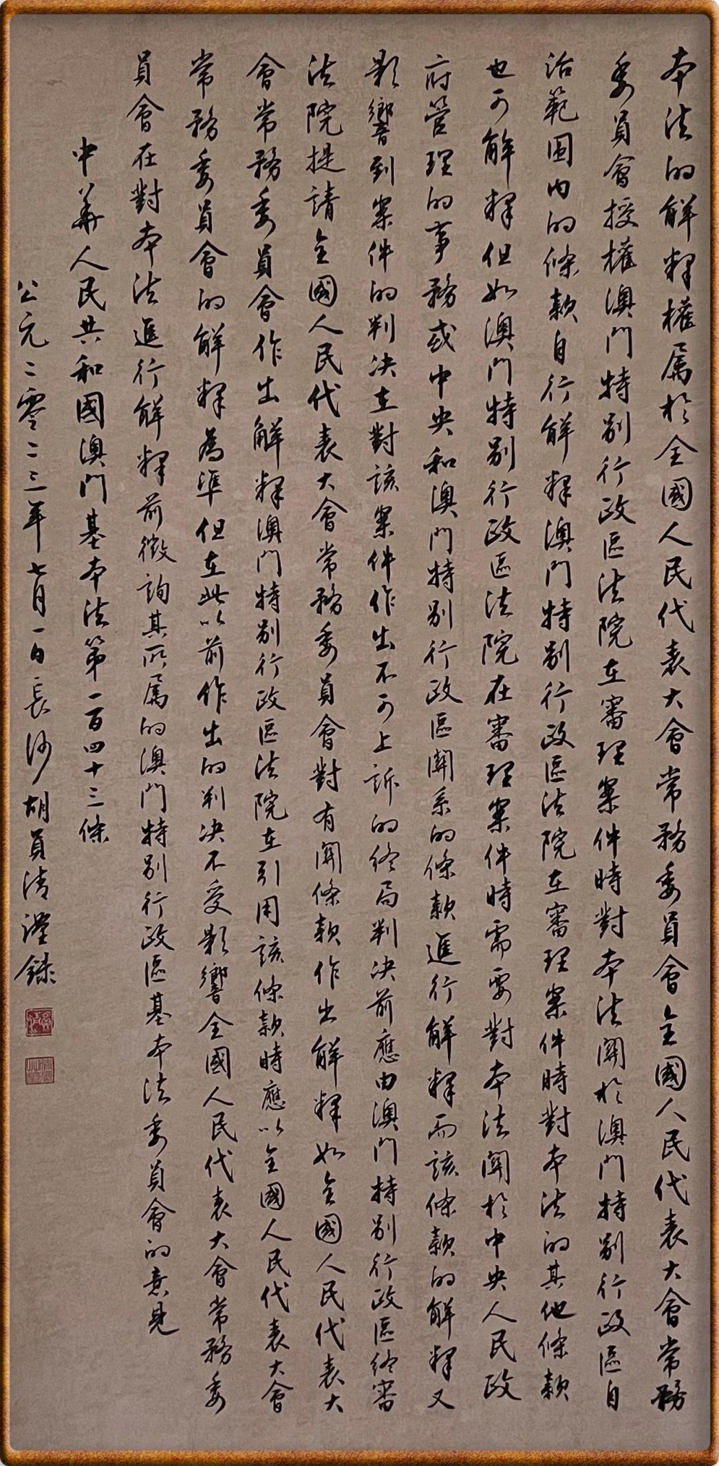 澳門基本法第一百四十三條 本法的解釋權屬于全國人民代表大會常務委員會。