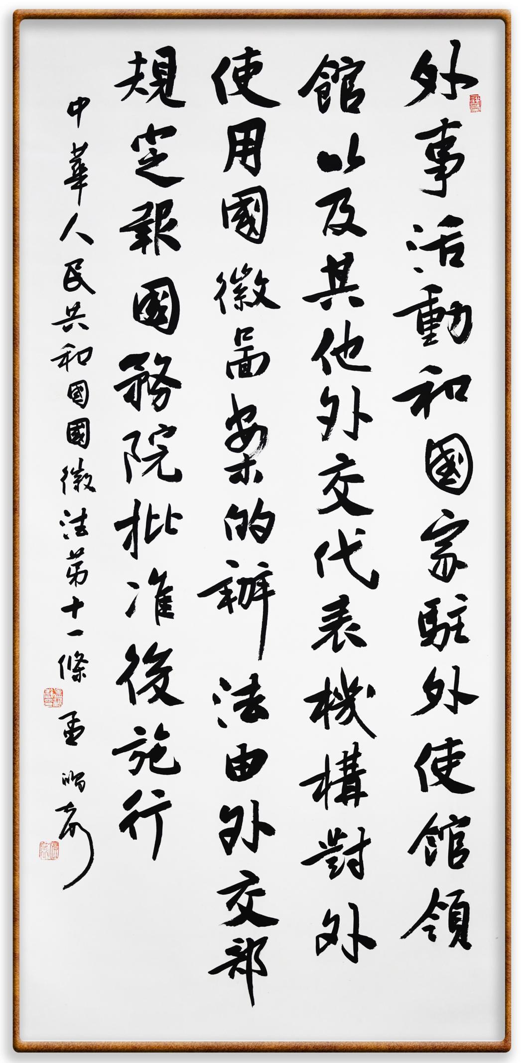國徽法第十一條 外事活動(dòng)和國家駐外使館、領(lǐng)館以及其他外交代表機(jī)構(gòu)對(duì)外使用國徽?qǐng)D案的辦法,由外交部規(guī)定,報(bào)國務(wù)院批準(zhǔn)后施行。