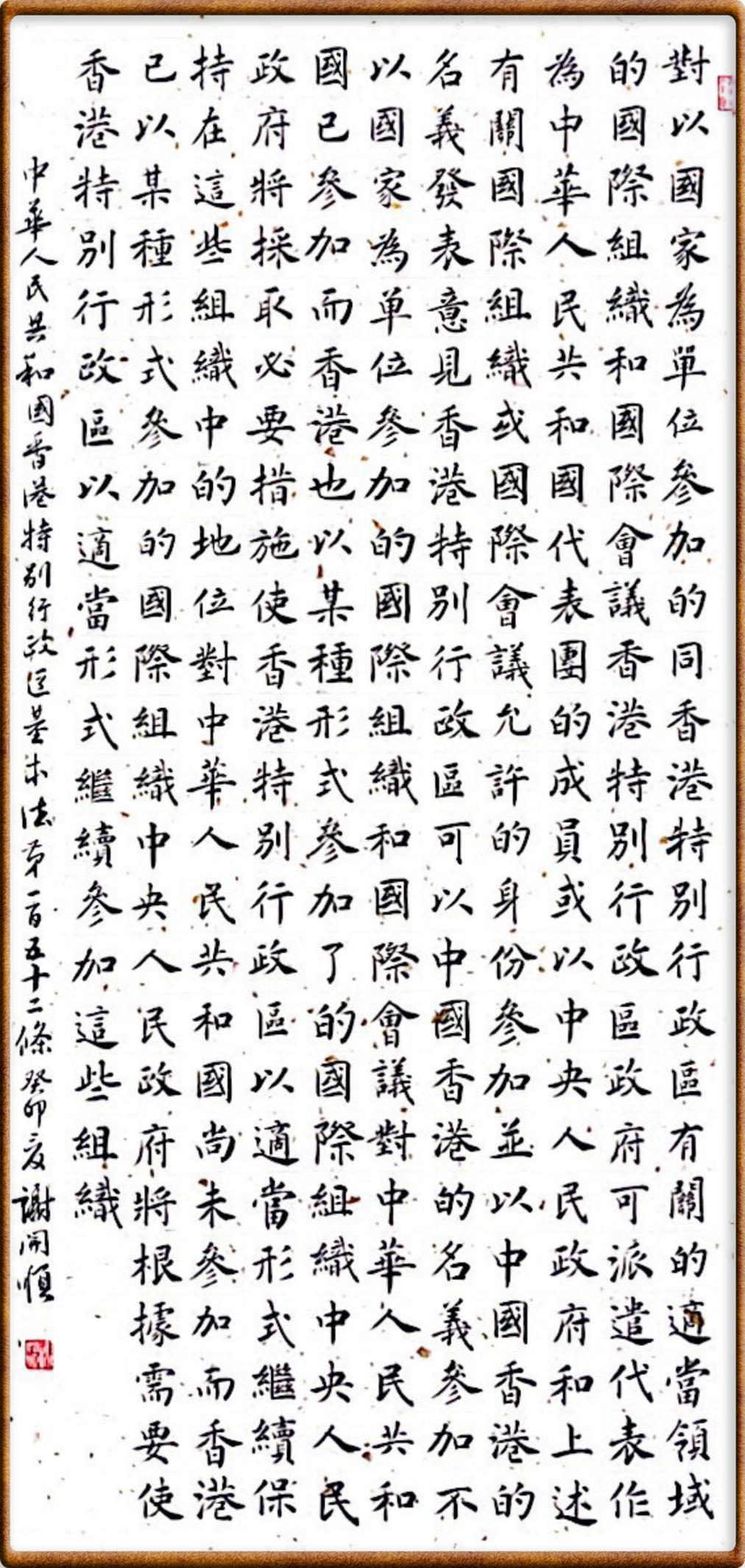 香港基本法第一百五十二條 對以國家為單位參加的、同香港特別行政區(qū)有關(guān)的、適當領(lǐng)域的國際組織和國際會議,香港特別行政區(qū)政府可派遣代表作為中華人民共和國代表團的成員或以中央人民政府和上述有關(guān)國際組織或國際會議允許的身份參加,并以“中國香港”的名義發(fā)表意見。