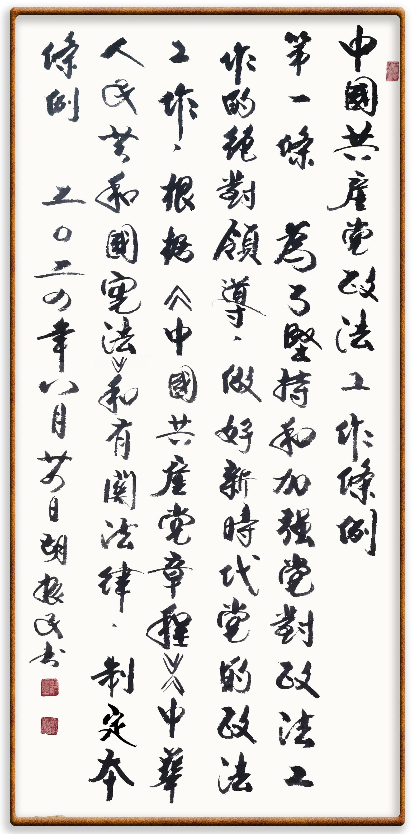 《中國(guó)共產(chǎn)黨政法工作條例》對(duì)黨領(lǐng)導(dǎo)新時(shí)代政法工作進(jìn)行全面制度擘畫,為黨領(lǐng)導(dǎo)政法工作提供基本遵循,具有重大而深遠(yuǎn)的意義。為學(xué)習(xí)好、宣傳好、貫徹好、實(shí)施好這部黨內(nèi)法規(guī),繼《中華人民共和國(guó)民法典》《中華人民共和國(guó)憲法》《信訪工作條例》《中華人民共和國(guó)澳門特別行政區(qū)基本法》《中華人民共和國(guó)香港特別行政區(qū)基本法》等法律法規(guī)之后,“書(shū)·法”系列活動(dòng)將筆端對(duì)準(zhǔn)《中國(guó)共產(chǎn)黨政法工作條例》。