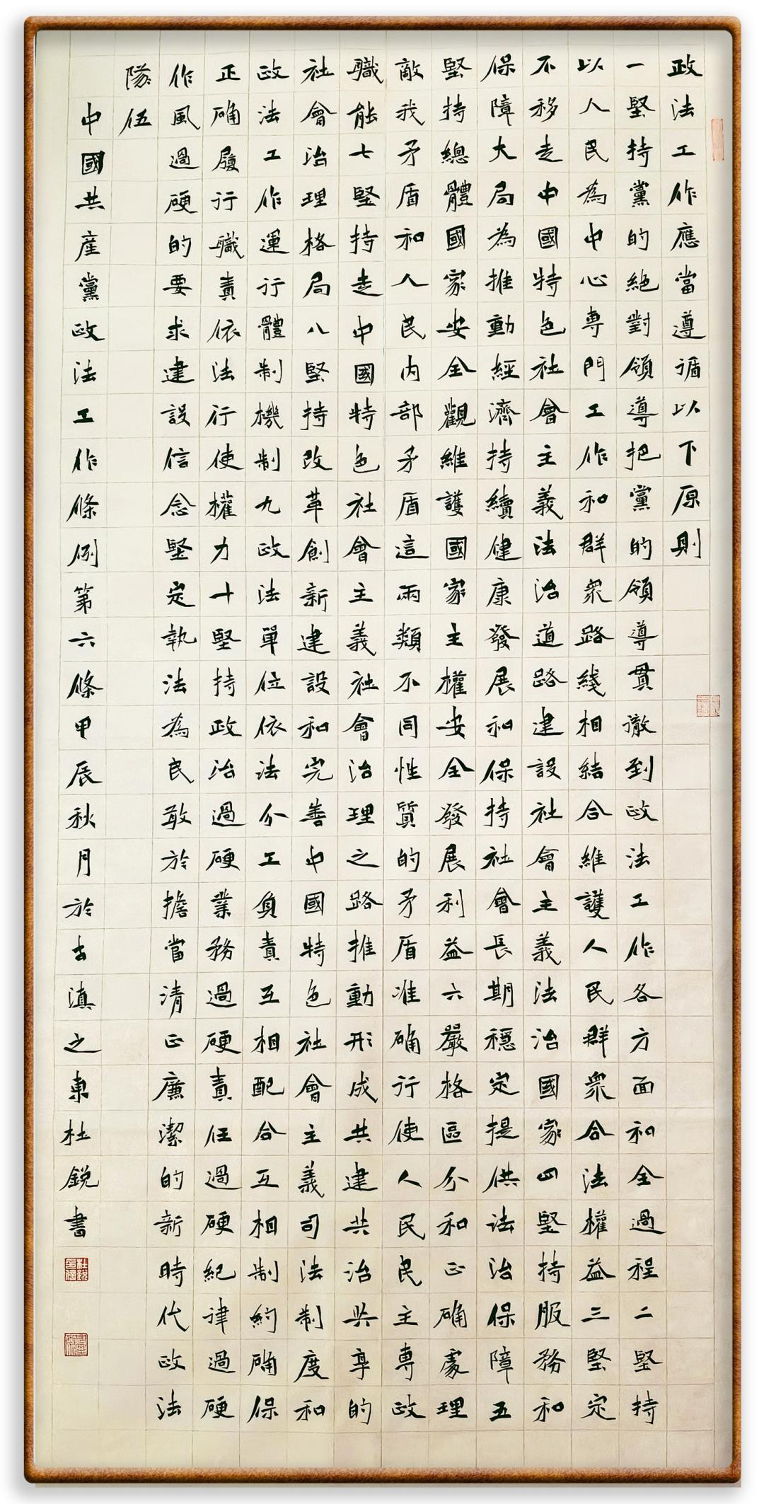 《中國共產黨政法工作條例》對黨領導新時代政法工作進行全面制度擘畫,為黨領導政法工作提供基本遵循,具有重大而深遠的意義。為學習好、宣傳好、貫徹好、實施好這部黨內法規(guī),繼《中華人民共和國民法典》《中華人民共和國憲法》《信訪工作條例》《中華人民共和國澳門特別行政區(qū)基本法》《中華人民共和國香港特別行政區(qū)基本法》等法律法規(guī)之后,“書·法”系列活動將筆端對準《中國共產黨政法工作條例》。