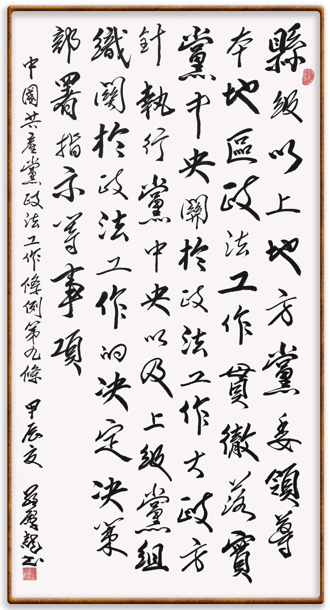 《中國共產(chǎn)黨政法工作條例》對黨領(lǐng)導(dǎo)新時(shí)代政法工作進(jìn)行全面制度擘畫,為黨領(lǐng)導(dǎo)政法工作提供基本遵循,具有重大而深遠(yuǎn)的意義。為學(xué)習(xí)好、宣傳好、貫徹好、實(shí)施好這部黨內(nèi)法規(guī),繼《中華人民共和國民法典》《中華人民共和國憲法》《信訪工作條例》《中華人民共和國澳門特別行政區(qū)基本法》《中華人民共和國香港特別行政區(qū)基本法》等法律法規(guī)之后,“書·法”系列活動(dòng)將筆端對準(zhǔn)《中國共產(chǎn)黨政法工作條例》。