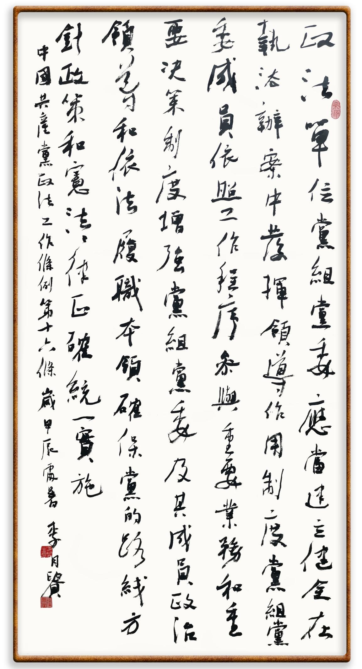 《中國共產(chǎn)黨政法工作條例》對黨領導新時代政法工作進行全面制度擘畫,為黨領導政法工作提供基本遵循,具有重大而深遠的意義。為學習好、宣傳好、貫徹好、實施好這部黨內(nèi)法規(guī),繼《中華人民共和國民法典》《中華人民共和國憲法》《信訪工作條例》《中華人民共和國澳門特別行政區(qū)基本法》《中華人民共和國香港特別行政區(qū)基本法》等法律法規(guī)之后,“書·法”系列活動將筆端對準《中國共產(chǎn)黨政法工作條例》。