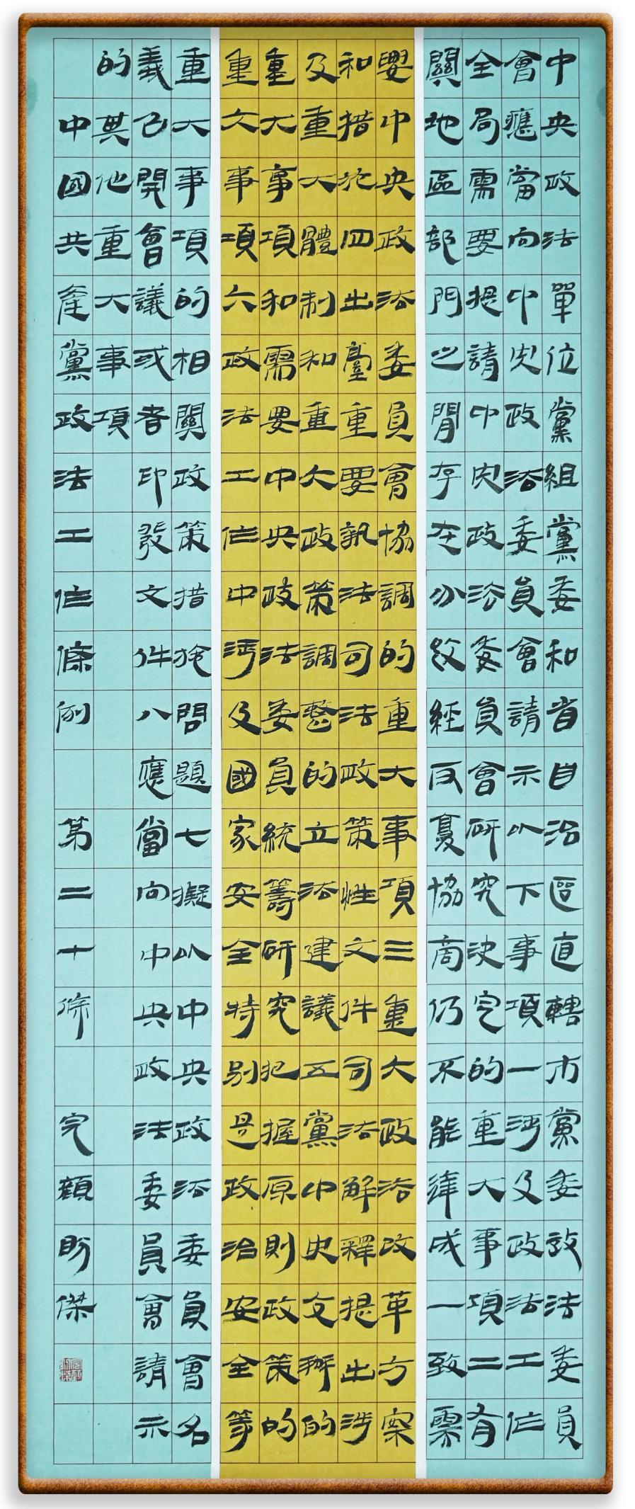 《中國共產(chǎn)黨政法工作條例》對黨領(lǐng)導(dǎo)新時代政法工作進行全面制度擘畫,為黨領(lǐng)導(dǎo)政法工作提供基本遵循,具有重大而深遠的意義。為學(xué)習(xí)好、宣傳好、貫徹好、實施好這部黨內(nèi)法規(guī),繼《中華人民共和國民法典》《中華人民共和國憲法》《信訪工作條例》《中華人民共和國澳門特別行政區(qū)基本法》《中華人民共和國香港特別行政區(qū)基本法》等法律法規(guī)之后,“書·法”系列活動將筆端對準(zhǔn)《中國共產(chǎn)黨政法工作條例》。