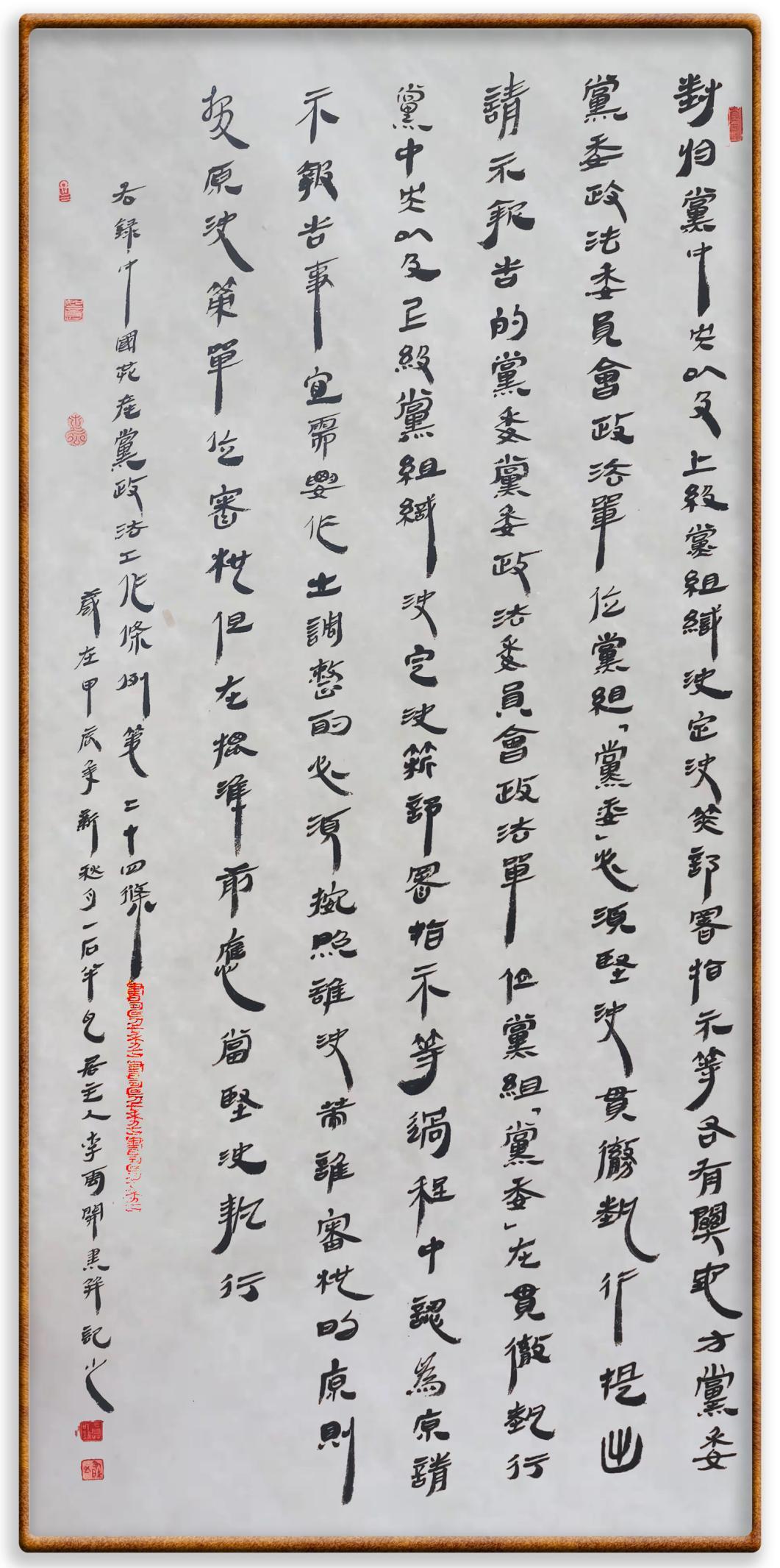 《中國共產(chǎn)黨政法工作條例》對黨領(lǐng)導新時代政法工作進行全面制度擘畫,為黨領(lǐng)導政法工作提供基本遵循,具有重大而深遠的意義。為學習好、宣傳好、貫徹好、實施好這部黨內(nèi)法規(guī),繼《中華人民共和國民法典》《中華人民共和國憲法》《信訪工作條例》《中華人民共和國澳門特別行政區(qū)基本法》《中華人民共和國香港特別行政區(qū)基本法》等法律法規(guī)之后,“書·法”系列活動將筆端對準《中國共產(chǎn)黨政法工作條例》。