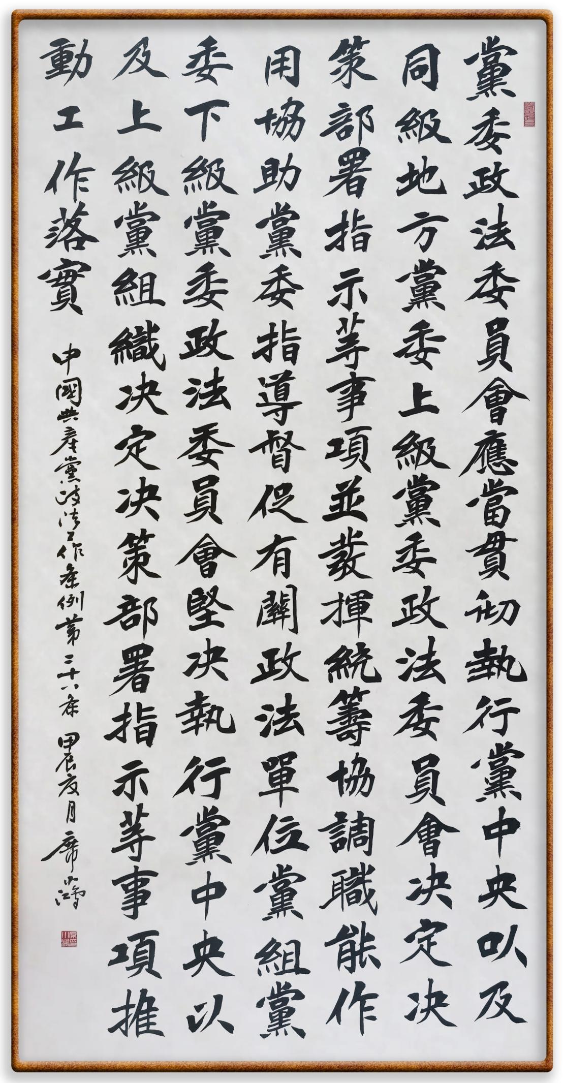 《中國共產(chǎn)黨政法工作條例》對黨領(lǐng)導(dǎo)新時(shí)代政法工作進(jìn)行全面制度擘畫,為黨領(lǐng)導(dǎo)政法工作提供基本遵循,具有重大而深遠(yuǎn)的意義。為學(xué)習(xí)好、宣傳好、貫徹好、實(shí)施好這部黨內(nèi)法規(guī),繼《中華人民共和國民法典》《中華人民共和國憲法》《信訪工作條例》《中華人民共和國澳門特別行政區(qū)基本法》《中華人民共和國香港特別行政區(qū)基本法》等法律法規(guī)之后,“書·法”系列活動將筆端對準(zhǔn)《中國共產(chǎn)黨政法工作條例》。