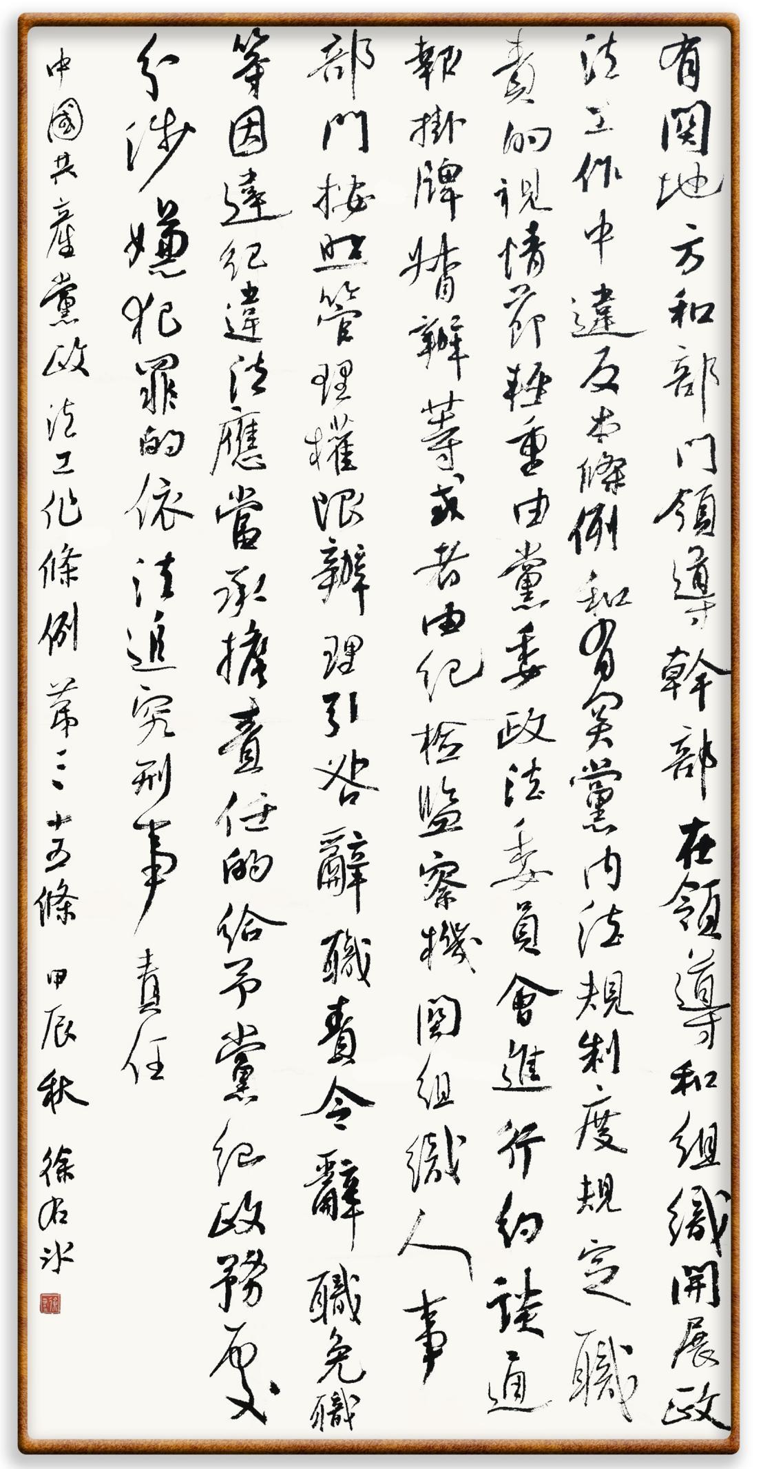 《中國共產(chǎn)黨政法工作條例》對黨領(lǐng)導(dǎo)新時(shí)代政法工作進(jìn)行全面制度擘畫,為黨領(lǐng)導(dǎo)政法工作提供基本遵循,具有重大而深遠(yuǎn)的意義。為學(xué)習(xí)好、宣傳好、貫徹好、實(shí)施好這部黨內(nèi)法規(guī),繼《中華人民共和國民法典》《中華人民共和國憲法》《信訪工作條例》《中華人民共和國澳門特別行政區(qū)基本法》《中華人民共和國香港特別行政區(qū)基本法》等法律法規(guī)之后,“書·法”系列活動將筆端對準(zhǔn)《中國共產(chǎn)黨政法工作條例》。