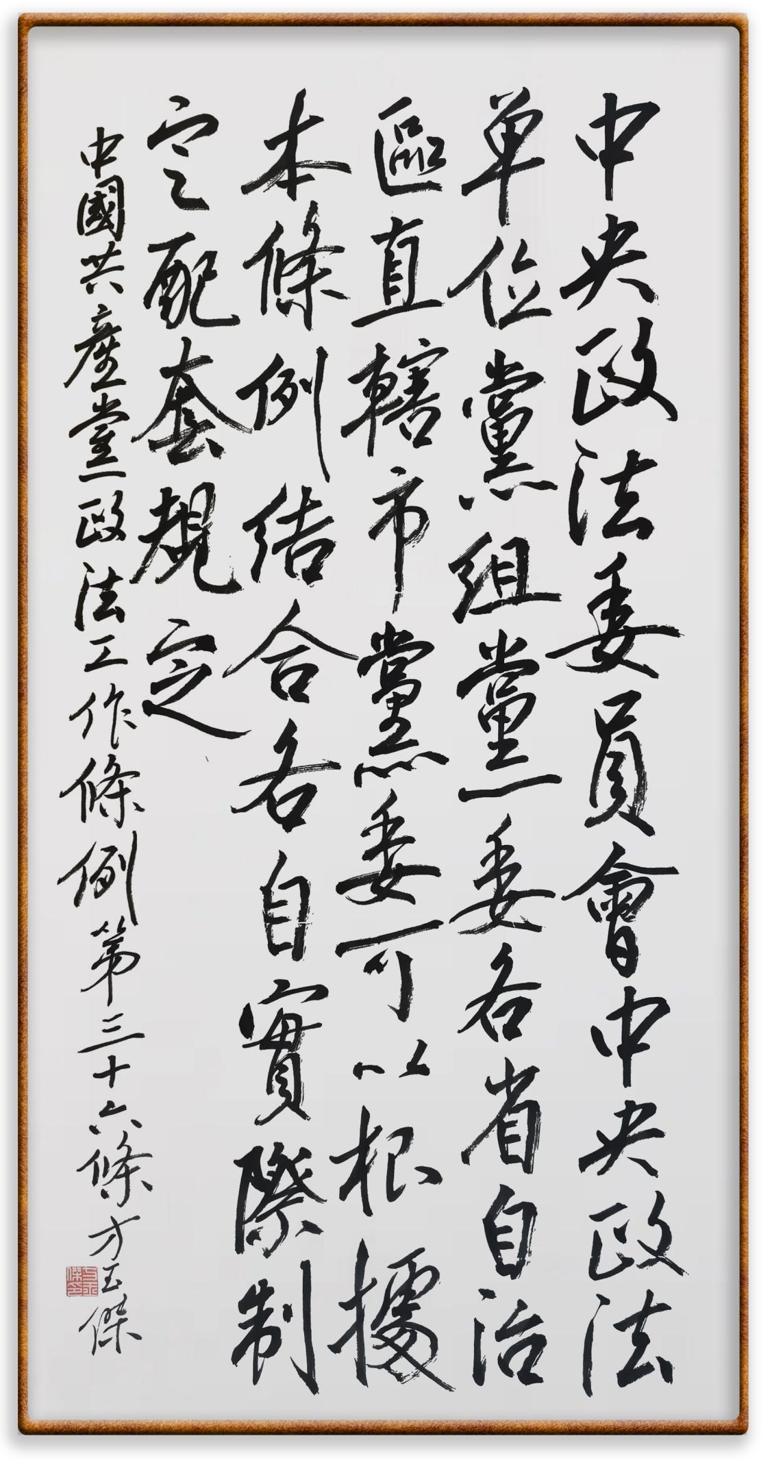 《中國共產(chǎn)黨政法工作條例》對黨領(lǐng)導新時代政法工作進行全面制度擘畫,為黨領(lǐng)導政法工作提供基本遵循,具有重大而深遠的意義。為學習好、宣傳好、貫徹好、實施好這部黨內(nèi)法規(guī),繼《中華人民共和國民法典》《中華人民共和國憲法》《信訪工作條例》《中華人民共和國澳門特別行政區(qū)基本法》《中華人民共和國香港特別行政區(qū)基本法》等法律法規(guī)之后,“書·法”系列活動將筆端對準《中國共產(chǎn)黨政法工作條例》。