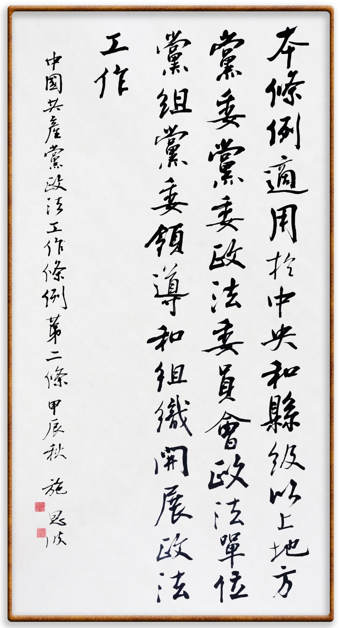 《中國共產(chǎn)黨政法工作條例》對黨領(lǐng)導(dǎo)新時(shí)代政法工作進(jìn)行全面制度擘畫,為黨領(lǐng)導(dǎo)政法工作提供基本遵循,具有重大而深遠(yuǎn)的意義。為學(xué)習(xí)好、宣傳好、貫徹好、實(shí)施好這部黨內(nèi)法規(guī),繼《中華人民共和國民法典》《中華人民共和國憲法》《信訪工作條例》《中華人民共和國澳門特別行政區(qū)基本法》《中華人民共和國香港特別行政區(qū)基本法》等法律法規(guī)之后,“書·法”系列活動將筆端對準(zhǔn)《中國共產(chǎn)黨政法工作條例》。