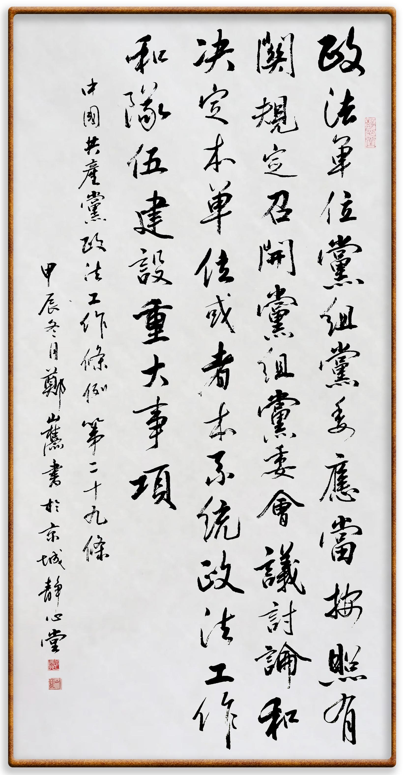 《中國共產(chǎn)黨政法工作條例》對黨領導新時代政法工作進行全面制度擘畫,為黨領導政法工作提供基本遵循,具有重大而深遠的意義。為學習好、宣傳好、貫徹好、實施好這部黨內(nèi)法規(guī),繼《中華人民共和國民法典》《中華人民共和國憲法》《信訪工作條例》《中華人民共和國澳門特別行政區(qū)基本法》《中華人民共和國香港特別行政區(qū)基本法》等法律法規(guī)之后,“書·法”系列活動將筆端對準《中國共產(chǎn)黨政法工作條例》。精彩內(nèi)容,敬請關注。