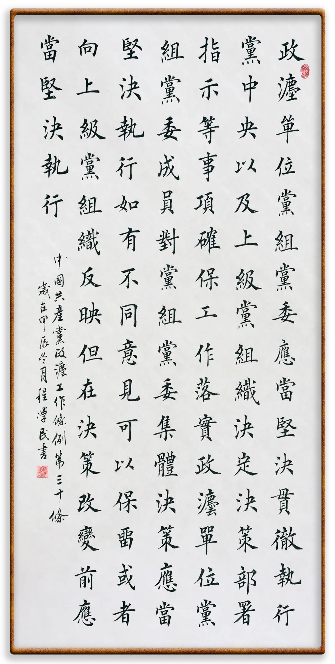《中國共產(chǎn)黨政法工作條例》對黨領導新時代政法工作進行全面制度擘畫,為黨領導政法工作提供基本遵循,具有重大而深遠的意義。為學習好、宣傳好、貫徹好、實施好這部黨內(nèi)法規(guī),繼《中華人民共和國民法典》《中華人民共和國憲法》《信訪工作條例》《中華人民共和國澳門特別行政區(qū)基本法》《中華人民共和國香港特別行政區(qū)基本法》等法律法規(guī)之后,“書·法”系列活動將筆端對準《中國共產(chǎn)黨政法工作條例》。