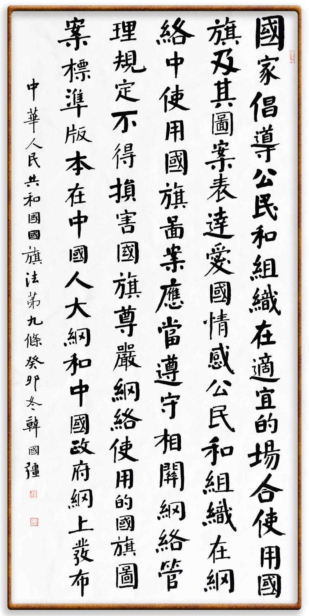 國旗法第九條 國家倡導公民和組織在適宜的場合使用國旗及其圖案,表達愛國情感。