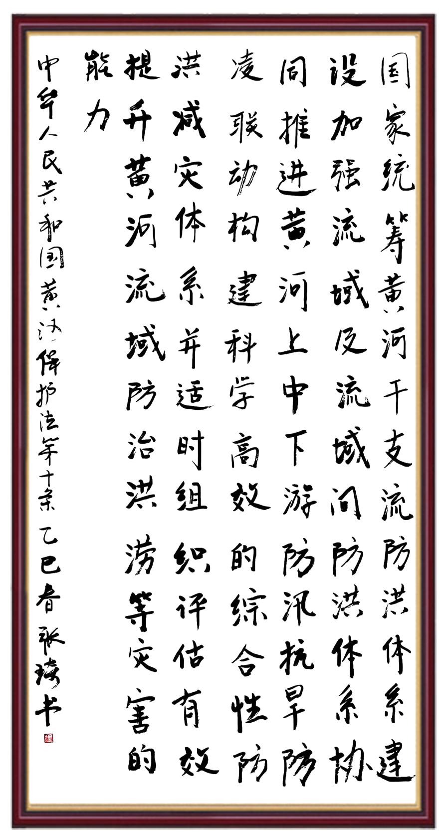 黃河寧,天下平。黃河是中華民族的發(fā)源地和搖籃,保護(hù)黃河是事關(guān)中華民族偉大復(fù)興的千秋大計(jì)?!吨腥A人民共和國黃河保護(hù)法》為推進(jìn)水資源節(jié)約集約利用、保護(hù)傳承弘揚(yáng)黃河文化、推動(dòng)黃河流域生態(tài)保護(hù)和高質(zhì)量發(fā)展提供了有力法治保障。繼書寫《中華人民共和國民法典》《中華人民共和國憲法》《中華人民共和國澳門特別行政區(qū)基本法》《中華人民共和國香港特別行政區(qū)基本法》《中華人民共和國國旗法》《中華人民共和國國徽法》《中華人民共和國國歌法》《中華人民共和國法官法》等法律法規(guī)之后,法制日報(bào)社聯(lián)合沿黃九?。▍^(qū))司法廳、書法家協(xié)會(huì),將筆端對準(zhǔn)《中華人民共和國黃河保護(hù)法》。