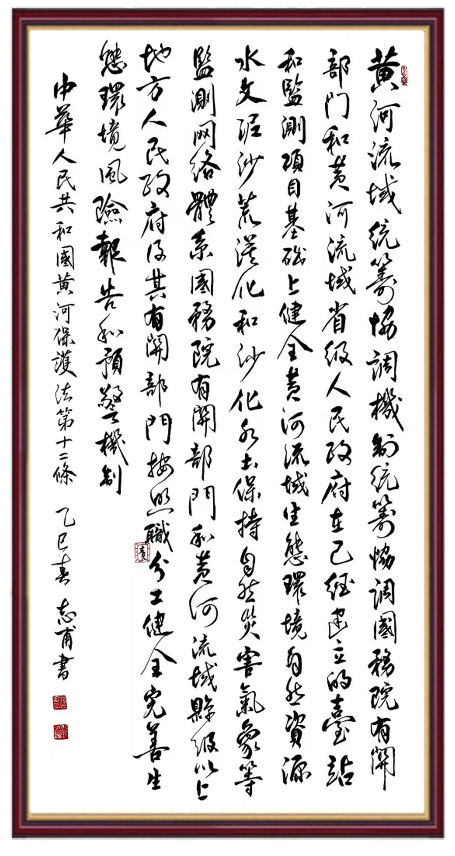 黃河寧,天下平。黃河是中華民族的發(fā)源地和搖籃,保護黃河是事關(guān)中華民族偉大復(fù)興的千秋大計?!吨腥A人民共和國黃河保護法》為推進水資源節(jié)約集約利用、保護傳承弘揚黃河文化、推動黃河流域生態(tài)保護和高質(zhì)量發(fā)展提供了有力法治保障。繼書寫《中華人民共和國民法典》《中華人民共和國憲法》《中華人民共和國澳門特別行政區(qū)基本法》《中華人民共和國香港特別行政區(qū)基本法》《中華人民共和國國旗法》《中華人民共和國國徽法》《中華人民共和國國歌法》《中華人民共和國法官法》等法律法規(guī)之后,法制日報社聯(lián)合沿黃九省(區(qū))司法廳、書法家協(xié)會,將筆端對準(zhǔn)《中華人民共和國黃河保護法》。