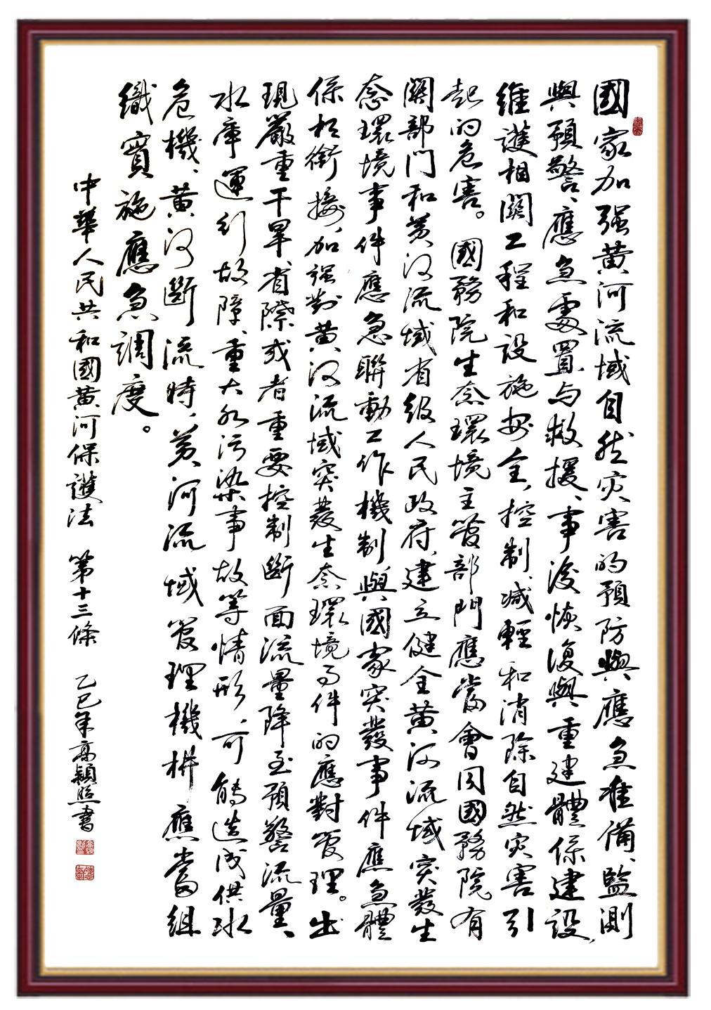 黃河寧,天下平。黃河是中華民族的發(fā)源地和搖籃,保護黃河是事關(guān)中華民族偉大復(fù)興的千秋大計。《中華人民共和國黃河保護法》為推進水資源節(jié)約集約利用、保護傳承弘揚黃河文化、推動黃河流域生態(tài)保護和高質(zhì)量發(fā)展提供了有力法治保障。繼書寫《中華人民共和國民法典》《中華人民共和國憲法》《中華人民共和國澳門特別行政區(qū)基本法》《中華人民共和國香港特別行政區(qū)基本法》《中華人民共和國國旗法》《中華人民共和國國徽法》《中華人民共和國國歌法》《中華人民共和國法官法》等法律法規(guī)之后,法制日報社聯(lián)合沿黃九?。▍^(qū))司法廳、書法家協(xié)會,將筆端對準(zhǔn)《中華人民共和國黃河保護法》。