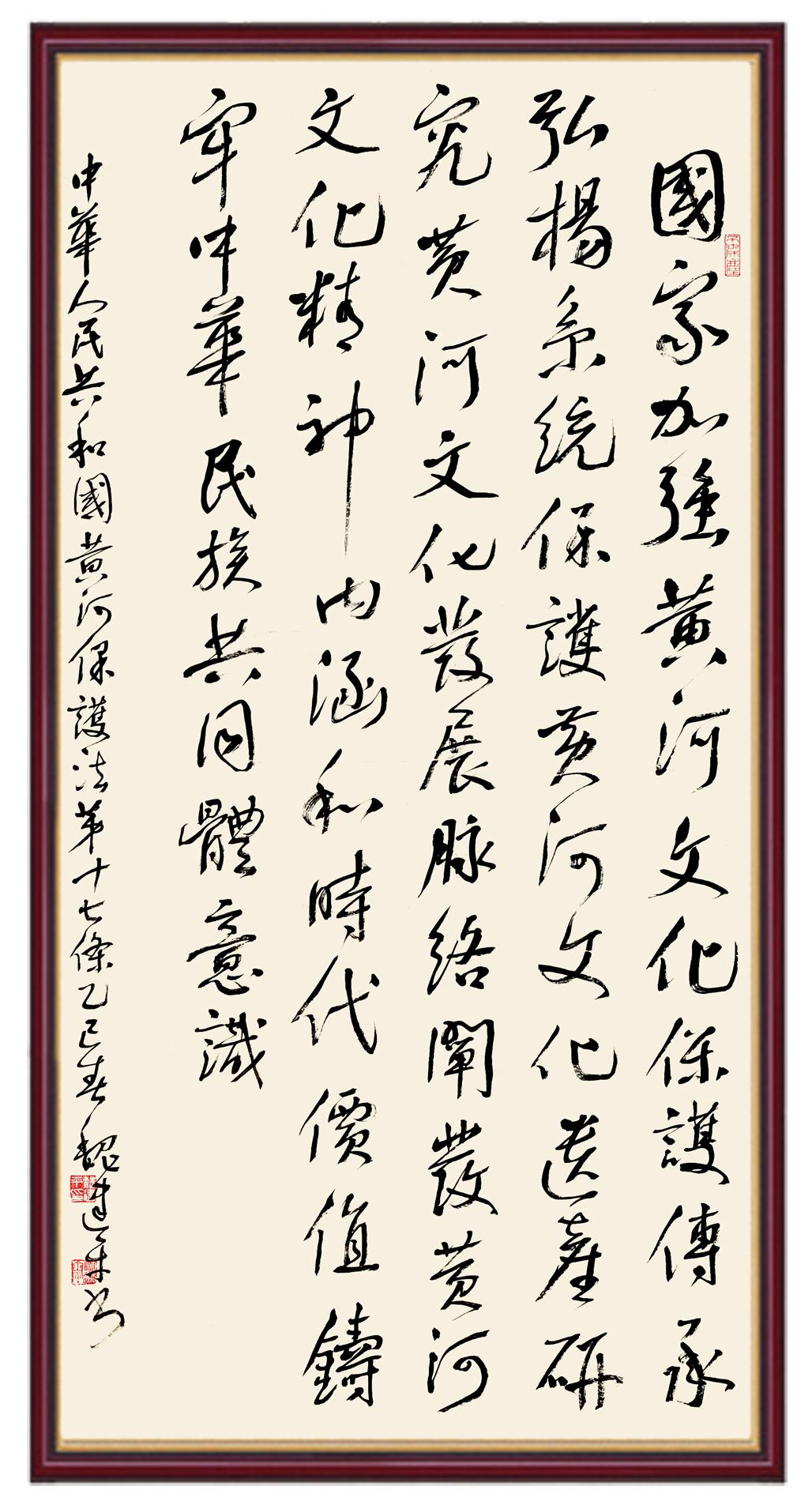 黃河寧,天下平。黃河是中華民族的發(fā)源地和搖籃,保護(hù)黃河是事關(guān)中華民族偉大復(fù)興的千秋大計?!吨腥A人民共和國黃河保護(hù)法》為推進(jìn)水資源節(jié)約集約利用、保護(hù)傳承弘揚黃河文化、推動黃河流域生態(tài)保護(hù)和高質(zhì)量發(fā)展提供了有力法治保障。繼書寫《中華人民共和國民法典》《中華人民共和國憲法》《中華人民共和國澳門特別行政區(qū)基本法》《中華人民共和國香港特別行政區(qū)基本法》《中華人民共和國國旗法》《中華人民共和國國徽法》《中華人民共和國國歌法》《中華人民共和國法官法》等法律法規(guī)之后,法制日報社聯(lián)合沿黃九?。▍^(qū))司法廳、書法家協(xié)會,將筆端對準(zhǔn)《中華人民共和國黃河保護(hù)法》。