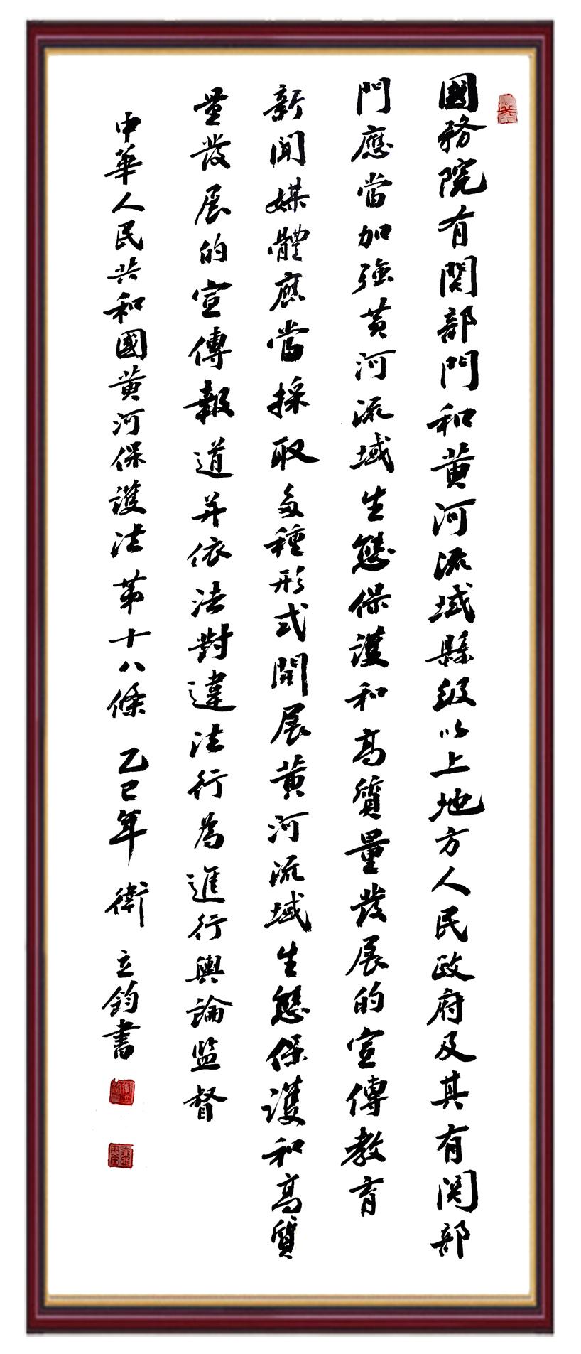 黃河寧,天下平。黃河是中華民族的發(fā)源地和搖籃,保護(hù)黃河是事關(guān)中華民族偉大復(fù)興的千秋大計(jì)?!吨腥A人民共和國(guó)黃河保護(hù)法》為推進(jìn)水資源節(jié)約集約利用、保護(hù)傳承弘揚(yáng)黃河文化、推動(dòng)黃河流域生態(tài)保護(hù)和高質(zhì)量發(fā)展提供了有力法治保障。繼書寫《中華人民共和國(guó)民法典》《中華人民共和國(guó)憲法》《中華人民共和國(guó)澳門特別行政區(qū)基本法》《中華人民共和國(guó)香港特別行政區(qū)基本法》《中華人民共和國(guó)國(guó)旗法》《中華人民共和國(guó)國(guó)徽法》《中華人民共和國(guó)國(guó)歌法》《中華人民共和國(guó)法官法》等法律法規(guī)之后,法制日?qǐng)?bào)社聯(lián)合沿黃九?。▍^(qū))司法廳、書法家協(xié)會(huì),將筆端對(duì)準(zhǔn)《中華人民共和國(guó)黃河保護(hù)法》。