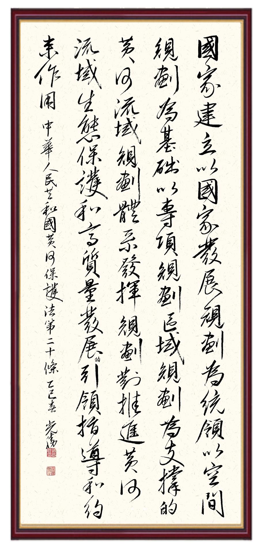 黃河寧,天下平。黃河是中華民族的發(fā)源地和搖籃,保護黃河是事關中華民族偉大復興的千秋大計?!吨腥A人民共和國黃河保護法》為推進水資源節(jié)約集約利用、保護傳承弘揚黃河文化、推動黃河流域生態(tài)保護和高質量發(fā)展提供了有力法治保障。繼書寫《中華人民共和國民法典》《中華人民共和國憲法》《中華人民共和國澳門特別行政區(qū)基本法》《中華人民共和國香港特別行政區(qū)基本法》《中華人民共和國國旗法》《中華人民共和國國徽法》《中華人民共和國國歌法》《中華人民共和國法官法》等法律法規(guī)之后,法制日報社聯(lián)合沿黃九?。▍^(qū))司法廳、書法家協(xié)會,將筆端對準《中華人民共和國黃河保護法》。