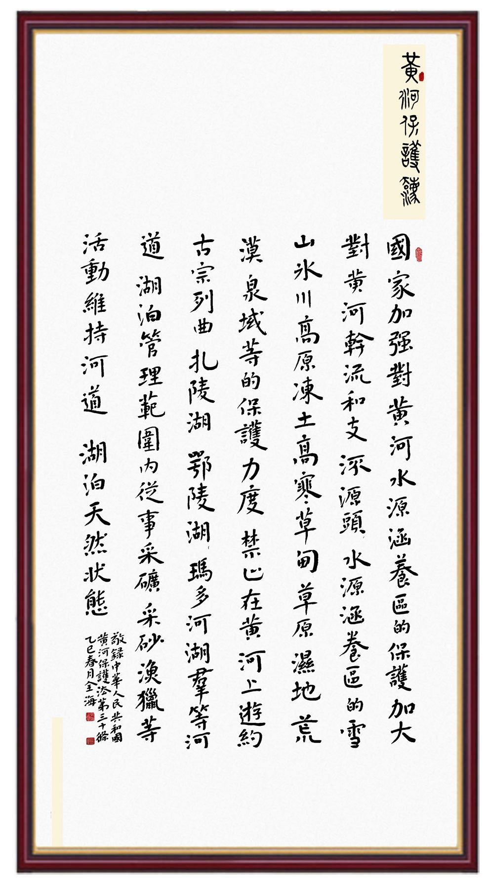 黃河寧,天下平。黃河是中華民族的發(fā)源地和搖籃,保護黃河是事關中華民族偉大復興的千秋大計?!吨腥A人民共和國黃河保護法》為推進水資源節(jié)約集約利用、保護傳承弘揚黃河文化、推動黃河流域生態(tài)保護和高質量發(fā)展提供了有力法治保障。繼書寫《中華人民共和國民法典》《中華人民共和國憲法》《中華人民共和國澳門特別行政區(qū)基本法》《中華人民共和國香港特別行政區(qū)基本法》《中華人民共和國國旗法》《中華人民共和國國徽法》《中華人民共和國國歌法》《中華人民共和國法官法》等法律法規(guī)之后,法制日報社聯合沿黃九省(區(qū))司法廳、書法家協會,將筆端對準《中華人民共和國黃河保護法》。