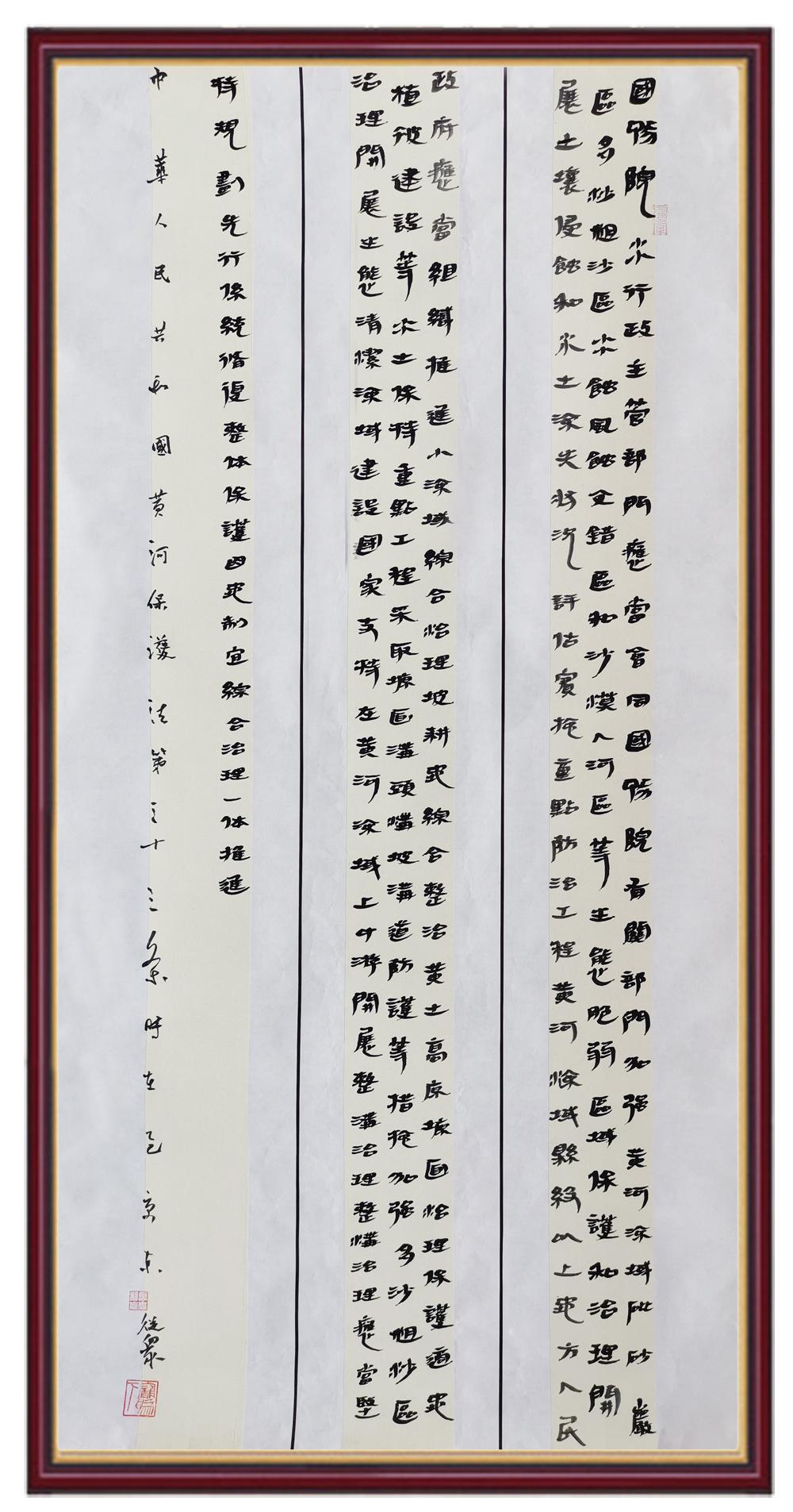 黃河寧,天下平。黃河是中華民族的發(fā)源地和搖籃,保護(hù)黃河是事關(guān)中華民族偉大復(fù)興的千秋大計(jì)?!吨腥A人民共和國(guó)黃河保護(hù)法》為推進(jìn)水資源節(jié)約集約利用、保護(hù)傳承弘揚(yáng)黃河文化、推動(dòng)黃河流域生態(tài)保護(hù)和高質(zhì)量發(fā)展提供了有力法治保障。繼書寫《中華人民共和國(guó)民法典》《中華人民共和國(guó)憲法》《中華人民共和國(guó)澳門特別行政區(qū)基本法》《中華人民共和國(guó)香港特別行政區(qū)基本法》《中華人民共和國(guó)國(guó)旗法》《中華人民共和國(guó)國(guó)徽法》《中華人民共和國(guó)國(guó)歌法》《中華人民共和國(guó)法官法》等法律法規(guī)之后,法制日?qǐng)?bào)社聯(lián)合沿黃九?。▍^(qū))司法廳、書法家協(xié)會(huì),將筆端對(duì)準(zhǔn)《中華人民共和國(guó)黃河保護(hù)法》。