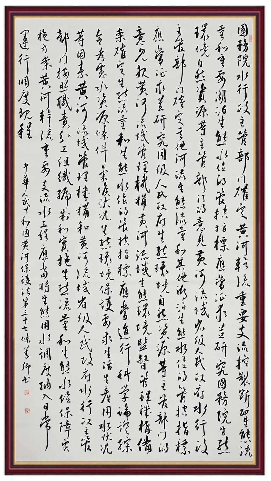 黃河寧,天下平。黃河是中華民族的發(fā)源地和搖籃,保護(hù)黃河是事關(guān)中華民族偉大復(fù)興的千秋大計(jì)?!吨腥A人民共和國黃河保護(hù)法》為推進(jìn)水資源節(jié)約集約利用、保護(hù)傳承弘揚(yáng)黃河文化、推動(dòng)黃河流域生態(tài)保護(hù)和高質(zhì)量發(fā)展提供了有力法治保障。繼書寫《中華人民共和國民法典》《中華人民共和國憲法》《中華人民共和國澳門特別行政區(qū)基本法》《中華人民共和國香港特別行政區(qū)基本法》《中華人民共和國國旗法》《中華人民共和國國徽法》《中華人民共和國國歌法》《中華人民共和國法官法》等法律法規(guī)之后,法制日報(bào)社聯(lián)合沿黃九省(區(qū))司法廳、書法家協(xié)會,將筆端對準(zhǔn)《中華人民共和國黃河保護(hù)法》。